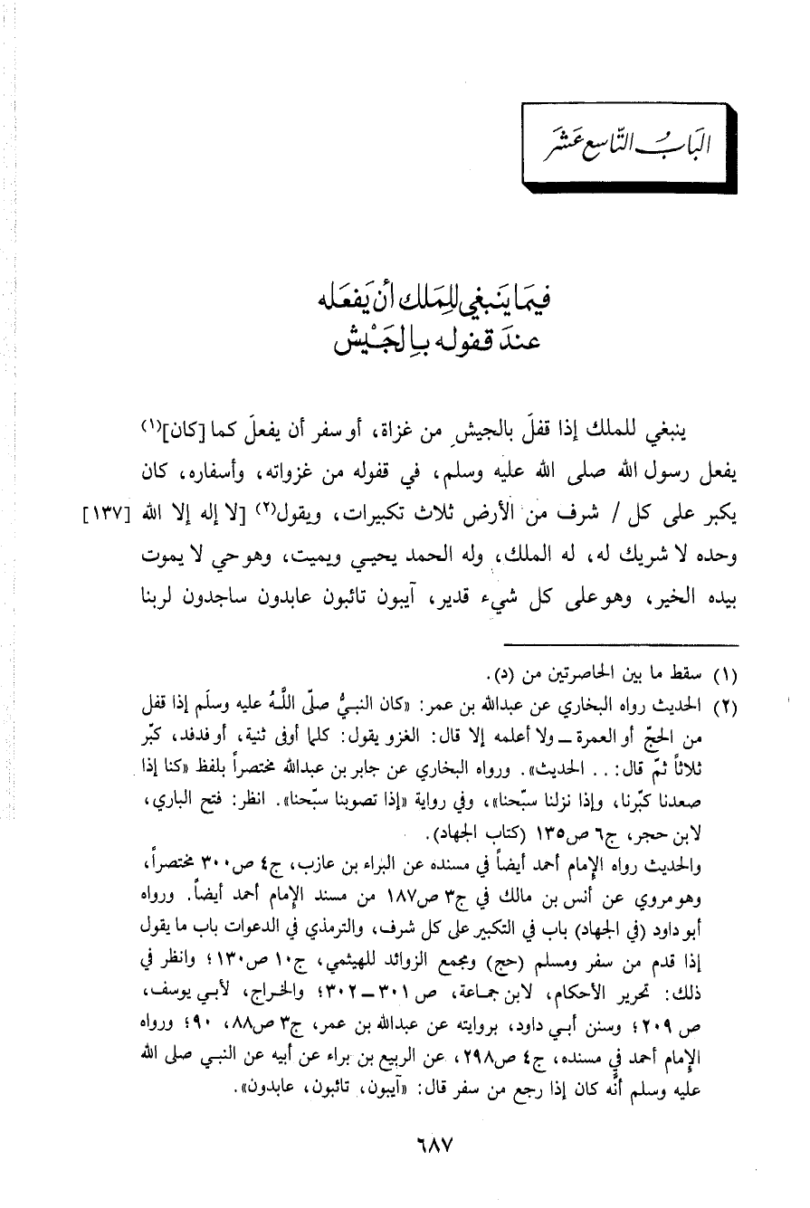 يَنْبَغِي للْملك إِذا قفل بالجيش من غزَاة أَو سفر أَن يفعل كَمَا كَانَ يفعل رَسُول الله صلى الله عَلَيْهِ وَسلم فِي قفوله من غَزَوَاته وأسفاره كَانَ يكبر على كل شرف من الأَرْض ثَلَاث تَكْبِيرَات وَيَقُول لاإله إِلَّا الله وَحده لاشريك لَهُ لَهُ الْملك وَله الْحَمد يحيى وَيُمِيت وَهُوَ حى لايموت بيدة الْخَيْر وَهُوَ على كل شَيْء قدير آيبون تائبون عَابِدُونَ ساجدون لربنا