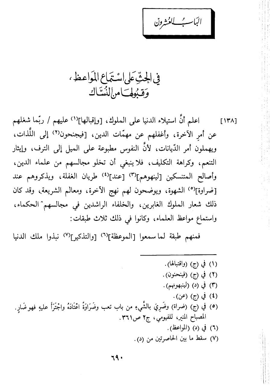 اعْلَم أَن اسْتِيلَاء الدُّنْيَا على الْمُلُوك وإقبالها عَلَيْهِم رُبمَا شغلهمْ عَن أَمر الْآخِرَة وأغفلهم عَن مهمات الدّين فيجنحون إِلَى اللَّذَّات ويهملون أَمر الديانَات لِأَن النُّفُوس مطبوعة على الْميل إِلَى الترف وإيثار التنعم وَكَرَاهَة التَّكْلِيف فَلَا يَنْبَغِي أَن تَخْلُو مجَالِسهمْ من عُلَمَاء الدّين وأصالح المتنسكين لينهوهم عِنْد طريان الْغَفْلَة ويذكروهم عِنْد ضراوة الشَّهْوَة ويوضحون لَهُم نهج الْآخِرَة ومعالم الشَّرِيعَة وَقد كَانَ ذَلِك شعار الْمُلُوك الغابرين وَالْخُلَفَاء الرَّاشِدين فِي مجَالِسهمْ الْحُكَمَاء واستماع مواعظ الْعلمَاء وَكَانُوا فِي ذَلِك ثَلَاث طَبَقَات