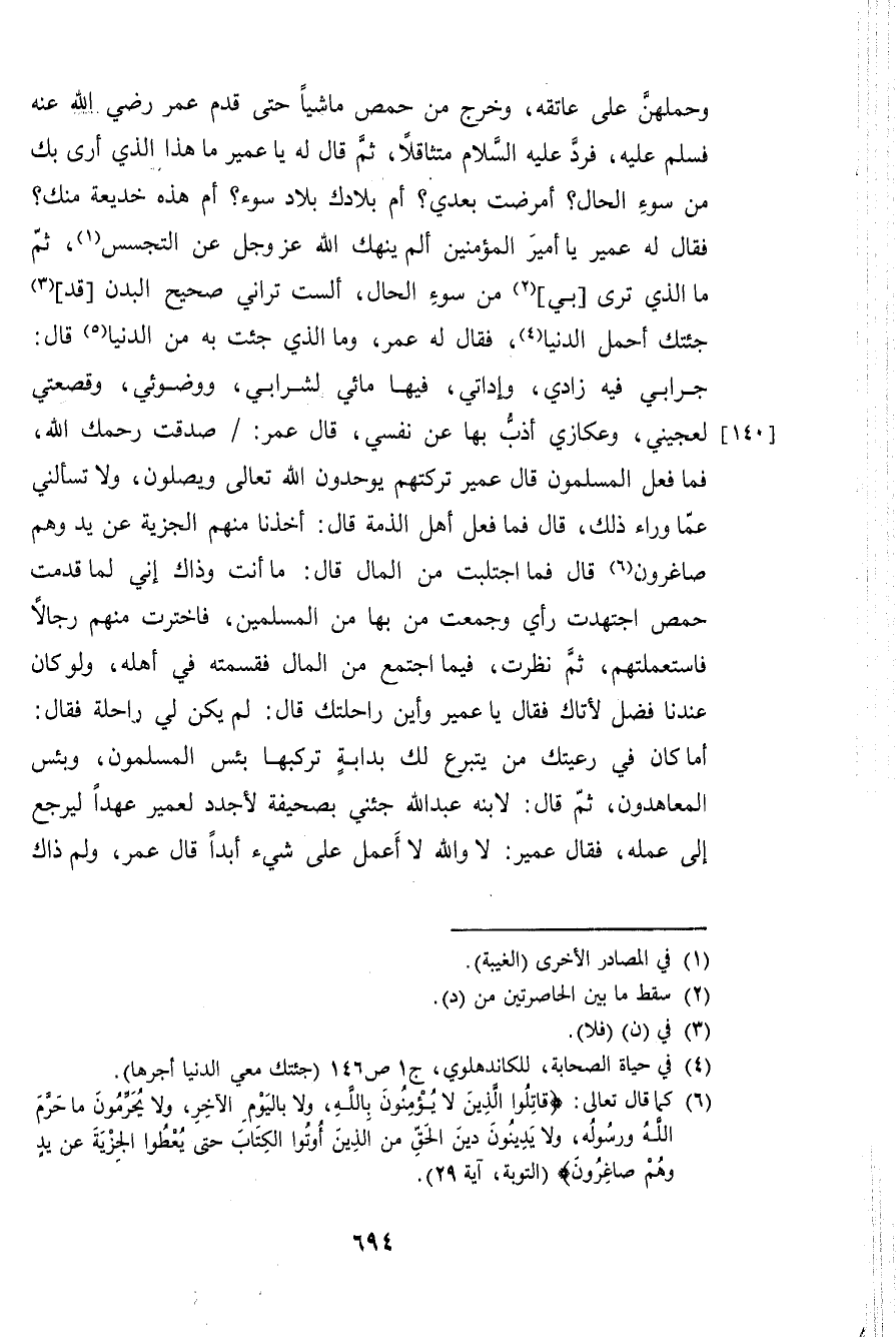 وحملهن على عَاتِقه وَخرج من حمص مَاشِيا حَتَّى قدم عمر بن الْخطاب رَضِي الله عَنهُ فَسلم عَلَيْهِ فَرد عَلَيْهِ السَّلَام متثاقلا ثمَّ قَالَ لَهُ عُمَيْر مَا هَذَا الَّذِي أرى بك من سوء الْحَال أمرضت بعدِي أم بلادك بِلَاد سوء أم هَذِه خديعة مِنْك فَقَالَ لَهُ عُمَيْر يَا امير الْمُؤمنِينَ ألم ينهك الله عز وَجل عَن التَّجَسُّس ثمَّ مَا الَّذِي ترى بِي من سوء الْحَال أَلَسْت تراني صَحِيح الْبدن قد جئْتُك أحمل الدُّنْيَا فَقَالَ لَهُ عمر وَمَا الَّذِي جِئْت بِهِ من الدُّنْيَا قَالَ جرابي فِيهِ زادي وإداتي فِيهَا مائي لشرابي ووضوئي وقصعتي لعجيني وعكازي أذب بهَا عَن نَفسِي قَالَ عمر صدقت رَحِمك الله فَمَا فعل الْمُسلمُونَ قَالَ عُمَيْر تَركتهم يوحدون الله تَعَالَى وَيصلونَ وَلَا تَسْأَلنِي عَمَّا وَرَاء ذَلِك قَالَ فَمَا فعل أهل لذمة قَالَ أَخذنَا مِنْهُم الْجِزْيَة عَن يَد وهم صاغرون قَالَ فَمَا اجتلبت من المَال قَالَ مَا أَنْت وَذَاكَ إِنِّي لما قدمت حمص اجتهدت رَأْي وجمعت من بهَا من الْمُسلمين فاخترت مِنْهُم رجَالًا فاستعملتهم ثمَّ نظرت فِيمَا اجْتمع من المَال فقسمته فِي أَهله وَلَو كَانَ عندنَا فضل لأتاك فَقَالَ يَا عُمَيْر واين راحلتك قَالَ لم يكن لي رَاحِلَة فَقَالَ أما كَانَ فِي رعيتك من يتَبَرَّع لَك بِدَابَّة تركبها بئس الْمُسلمُونَ وَبئسَ المعاهدون ثمَّ قَالَ لِابْنِهِ عبد الله جئني بِصَحِيفَة لأجدد لعمير عهدا ليرْجع إِلَى عمله فَقَالَ عُمَيْر لَا وَالله لَا أعمل على شَيْء أبدا قَالَ عمر وَلم ذَاك