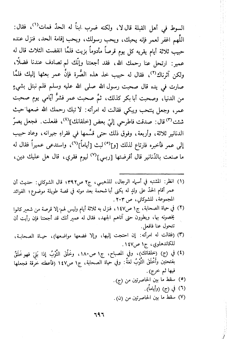 السَّوْط فِي أهل الْقبْلَة قَالَ لَا وَلكنه ضرب ابْنا لَهُ الْحَد فَمَاتَ فَقَالَ اللَّهُمَّ اغْفِر لعمر فَإِنَّهُ يحبك وَيُحب رَسُولك وَيُحب إِقَامَة الْحَد فَنزل عِنْده حبيب ثَلَاثَة أَيَّام يقريه كل يَوْم قرصا مأدوما بِزَيْت فَلَمَّا انْقَضتْ الثَّلَاث قَالَ لَهُ عُمَيْر ارتحل عَنَّا رَحِمك الله فقد أجعتنا وَإنَّك لم تصادف عندنَا فضلا وَلَكِن آثرناك فَقَالَ لَهُ حبيب خُذ هَذِه الصرة فَإِن عمر بعثها إِلَيْك فَلَمَّا صَارَت فِي يَده قَالَ صَحِبت رَسُول الله ص = فَلم نَبْتَل بِشَيْء من الدُّنْيَا وصحبت أَبَا بكر كَذَلِك ثمَّ صَحِبت عمر فشر أيامي يَوْم صَحِبت عمر وَجعل ينتحب ويبكي فَقَالَت لَهُ امْرَأَته لَا تبك رَحِمك الله ضعها حَيْثُ شِئْت قَالَ صدقت فاطرحي إِلَيّ بعض خلقانك فَفعلت فَجعل يصر الدَّنَانِير ثَلَاثَة وَأَرْبَعَة وَفَوق ذَلِك حَتَّى قسمهَا فِي فُقَرَاء جِيرَانه وَعَاد حبيب إِلَى عمر فَأخْبرهُ فارتاع لذَلِك ولبث أَيَّامًا واستدعى عُمَيْرًا فَقَالَ لَهُ مَا صنعت بِالدَّنَانِيرِ قَالَ أقرضتها رَبِّي ليَوْم فقري قَالَ هَل عَلَيْك دين
