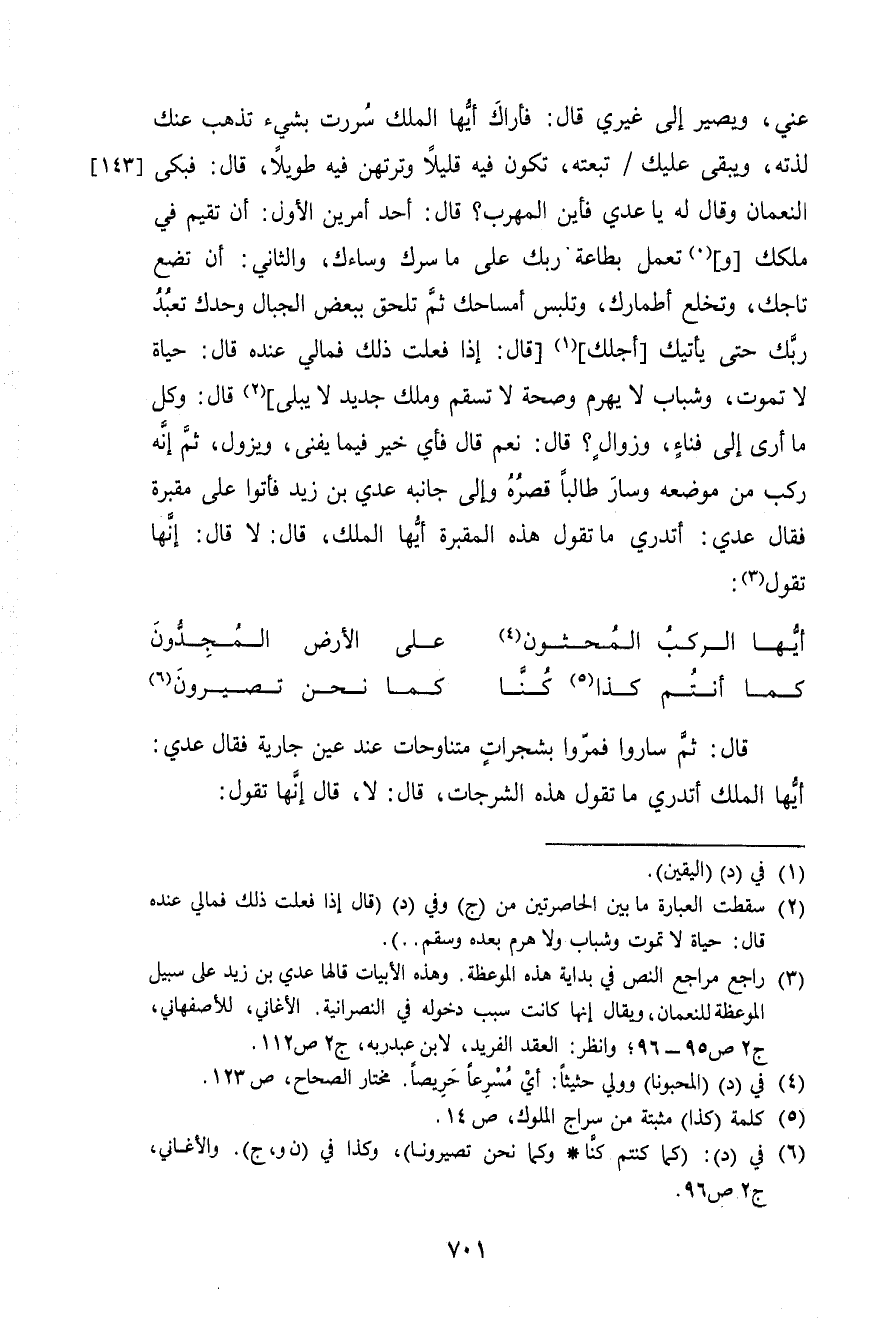 عني وَيصير إِلَيّ غَيْرِي قَالَ فَأَرَاك أَيهَا الْملك سررت بِشَيْء تذْهب عَنْك لذته وَيبقى عَلَيْك تَبعته تكون فِيهِ قَلِيلا وترتهن فِيهِ طَويلا قَالَ فَبكى النُّعْمَان وَقَالَ لَهُ يَا عدي فَأَيْنَ الْمَهْرَب قَالَ أحد أَمريْن الأول أَن تقيم فِي ملكك وتعمل بِطَاعَة رَبك على مَا سرك وساءك وَالثَّانِي أَن تضع تاجك وتخلع أطمارك وتلبس أمساحك ثمَّ تلْحق بِبَعْض الْجبَال وَحدك تعبد رَبك حَتَّى يَأْتِيك أَجلك قَالَ إِذا فعلت ذَلِك فَمَالِي عِنْده قَالَ حَيَاة لاتموت وشباب لايهرم وَصِحَّة لاتسقم وَملك جَدِيد لايبلى قَالَ وكل مَا أرى إِلَى فنَاء وَزَوَال قَالَ نعم قَالَ فَأَي خير فِيمَا يفنى وَيَزُول ثمَّ إِنَّه ركب من مَوْضِعه وَسَار طَالبا قصره وَإِلَى جَانِبه عدي بن زيد فَأتوا على مَقْبرَة فَقَالَ عدي أَتَدْرِي مَا تَقول هَذِه الْمقْبرَة أَيهَا الْملك قَالَ لَا قَالَ إِنَّهَا تَقول