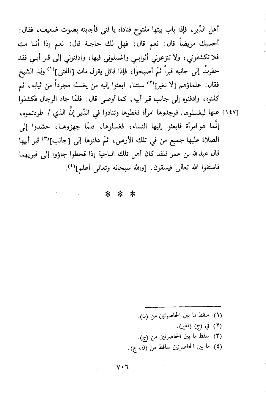 أهل الدَّيْر فَإِذا بَاب بَيتهَا مَفْتُوح فناداه يَا فَتى فأجابته بِصَوْت ضَعِيف فَقَالَ أحسبك مَرِيضا قَالَ نعم قَالَ فَهَل لَك حَاجَة قَالَ نعم إِذا انا مت فَلَا تكشفوني وَلَا تنزعوني أثوابي واغسلوني فِيهَا وادفنوني إِلَى قبر ابي فقد حفرت إِلَى جَانِبه قبرا ثمَّ أَصْبحُوا فَإِذا قَائِل يَقُول مَاتَ الْفَتى ولد الشَّيْخ فَقَالَ علماؤهم لَا نغير سنتنا أبعثوا إِلَيْهِ من يغسلهُ مُجَردا من ثِيَابه ثمَّ كفنوه وادفنوه إِلَى جَانب قبر أَبِيه كَمَا اوصى قَالَ فَلَمَّا جَاءَ الرِّجَال فكشفوا عَنْهَا ليغسلوها فوجدوها امْرَأَة فغطوها وتنادوا فِي الدَّيْر إِن الَّذِي طردتموه إِنَّمَا هُوَ امْرَأَة فَابْعَثُوا إِلَيْهَا النِّسَاء فغسلوها فَلَمَّا جهزوها حشدوا إِلَى الصَّلَاة عَلَيْهَا جَمِيع من فِي تِلْكَ الأَرْض ثمَّ دفنوها إِلَى جَانب قبر أَبِيهَا قَالَ عبد الله بن عمر فَلَقَد كَانَ اهل تِلْكَ النَّاحِيَة إِذا قحطوا جاؤوا إِلَى قبريهما فاستقوا الله تَعَالَى فيسقون وَالله سُبْحَانَهُ وَتَعَالَى أعلم