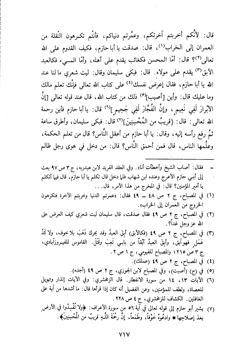 قَالَ لأنكم أخربتم آخرتكم وعمرتم دنياكم فَأنْتم تَكْرَهُونَ النقلَة من الْعمرَان إِلَى الخراب قَالَ صدقت يَا أَبَا حَازِم فَكيف الْقدوم على الله تَعَالَى قَالَ أما المحسن فكغائب يقدم على أَهله وَأما الْمُسِيء فكالعبد الْآبِق يقدم على مَوْلَاهُ قَالَ فَبكى سُلَيْمَان وَقَالَ لَيْت شعري مَا لنا عِنْد الله يَا أَبَا حَازِم فَقَالَ إعرض نَفسك على كتاب الله تَعَالَى فَإنَّك تعلم مَالك وَمَا عَلَيْك قَالَ وَأَيْنَ أُصِيب ذَلِك من كتاب الله قَالَ عِنْد قَوْله تَعَالَى {إِن الْأَبْرَار لفي نعيم وَإِن الْفجار لفي جحيم} قَالَ يَا أَبَا حَازِم فَأَيْنَ رَحْمَة الله تَعَالَى قَالَ {قريب من الْمُحْسِنِينَ} قَالَ فَبكى سُلَيْمَان وأطرق سَاعَة ثمَّ رفع رَأسه إِلَيْهِ وَقَالَ يَا أَبَا حَازِم من أَعقل النَّاس قَالَ من تعلم الْحِكْمَة وَعلمهَا النَّاس قَالَ فَمن أَحمَق النَّاس قَالَ من دخل فِي هوى رجل ظَالِم