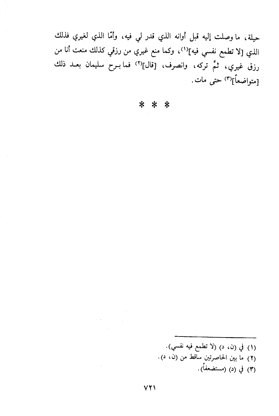 حِيلَة مَا وصلت إِلَيْهِ قبل أَوَانه الَّذِي قدر لي فِيهِ وَأما الَّذِي لغيري فَذَلِك الَّذِي لاتطمع نَفسِي فِيهِ وكما منع غَيْرِي من رِزْقِي كَذَلِك منعت أَنا من رزق غَيْرِي ثمَّ تَركه وَانْصَرف قَالَ فَمَا برح سُلَيْمَان بعد ذَلِك متواضعا حَتَّى مَاتَ