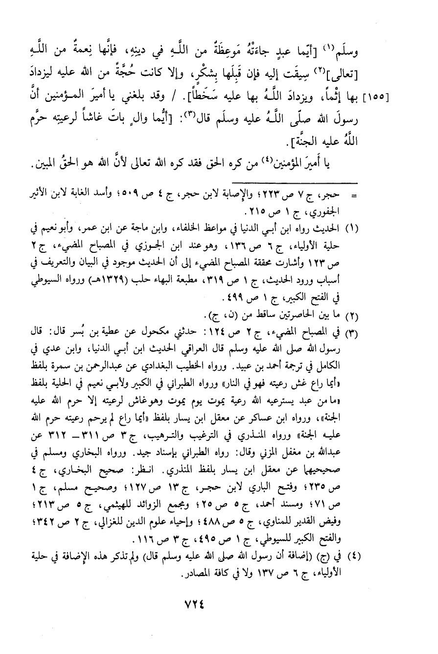 وَسلم أَيّمَا عبد جَاءَتْهُ موعظة من الله فِي دينه فَإِنَّهَا نعْمَة من الله تَعَالَى سيقت إِلَيْهِ فَإِن قبلهَا بشكر وَإِلَّا كَانَت حجَّة من الله عَلَيْهِ لِيَزْدَادَ بهَا إِثْمًا ويزداد الله بهَا عَلَيْهِ سخطا وَقد بَلغنِي يَا أَمِير الْمُؤمنِينَ أَن رَسُول الله صلى الله عَلَيْهِ وَسلم قَالَ أَيّمَا وَال بَات غاشا لرعيته حرم الله عَلَيْهِ الْجنَّة