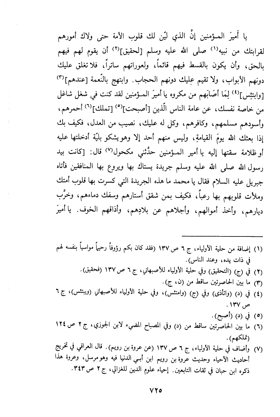 يَا أَمِير الْمُؤمنِينَ إِن الَّذِي لين لَك قُلُوب الْأمة حَتَّى ولاك أُمُورهم لقرابتك من نبيه ص = لحقيق أَن يقوم لَهُم فيهم بِالْحَقِّ وَأَن يكون بِالْقِسْطِ فيهم قَائِما ولعوراتهم ساترا فَلَا تغلق عَلَيْك دونهم الْأَبْوَاب وَلَا تقيم عَلَيْك دونهم الْحجاب وابتهج بِالنعْمَةِ عِنْدهم وابتئس لما أَصَابَهُم من مَكْرُوه يَا أَمِير الْمُؤمنِينَ لقد كنت فِي شغل شاغل من خَاصَّة نَفسك عَن عَامَّة النَّاس الَّذين أَصبَحت تملك أحمرهم وأسودهم مسلمهم وكافرهم وكل لَهُ عَلَيْك نصيب من الْعدْل فَكيف بك إِذا بَعثك الله يَوْم القيامه وَلَيْسَ مِنْهُم أحد إِلَّا وَهُوَ يشكو بلية أدخلتها عَلَيْهِ أوظلامة سقتها إِلَيْهِ يَا أَمِير الْمُؤمنِينَ حَدثنِي مَكْحُول قَالَ كَانَت بيد رَسُول الله صلى الله عَلَيْهِ وَسلم جَرِيدَة يستاك بهَا ويروع بهَا الْمُنَافِقين فَأَتَاهُ جِبْرِيل عَلَيْهِ السَّلَام فَقَالَ يَا مُحَمَّد مَا هَذِه الجريدة الَّتِي كسرت بهَا قُلُوب أمتك وملأت قُلُوبهم بهَا رعْبًا فَكيف بِمن شقق أستارهم وَسَفك دِمَاءَهُمْ وَخرب دِيَارهمْ وَأخذ أَمْوَالهم وأجلاهم عَن بِلَادهمْ وأذاقهم الْخَوْف يَا أَمِير