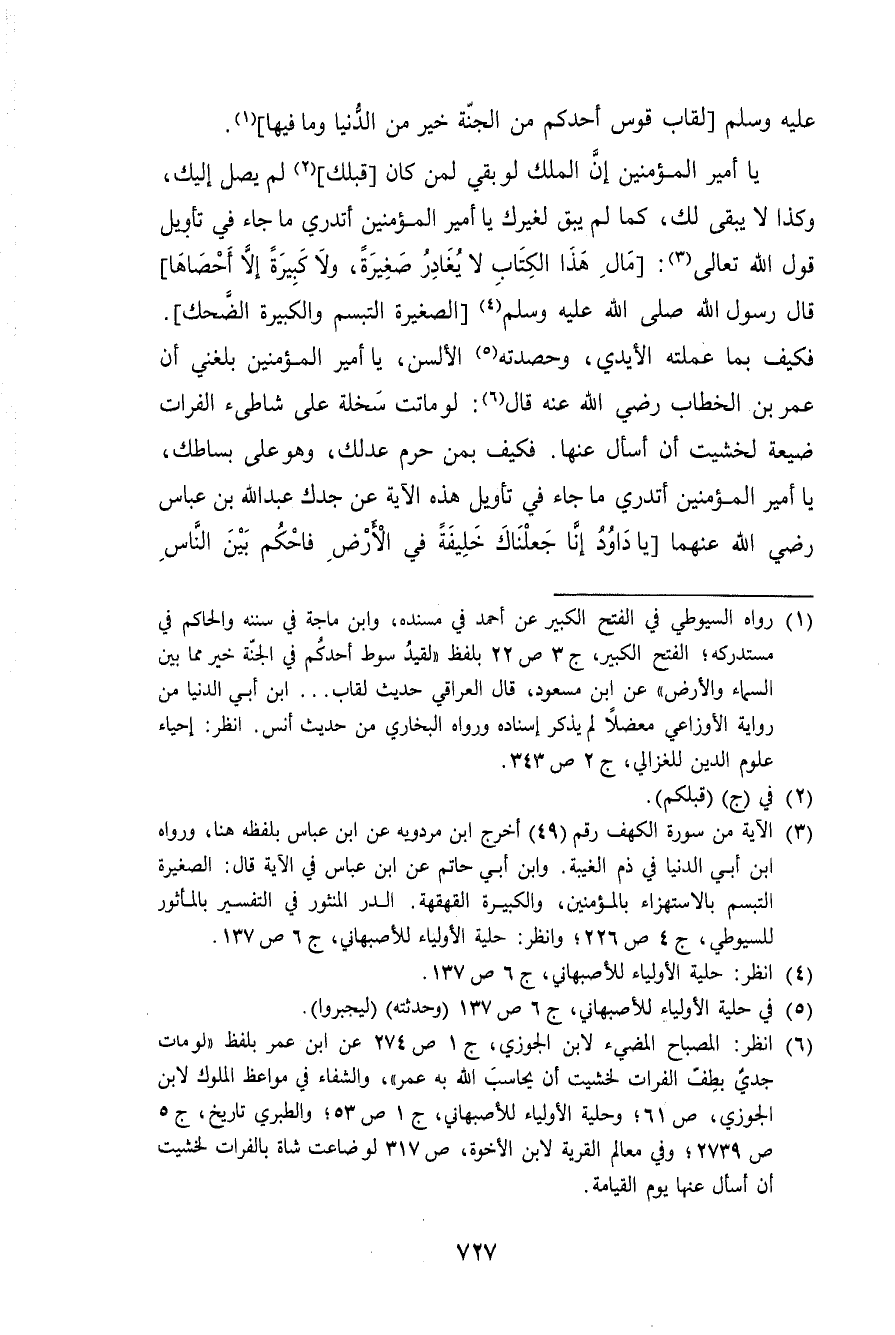 يَا امير الْمُؤمنِينَ إِن الْملك لَو بَقِي لمن كَانَ قبلك لم يصل إِلَيْك وَكَذَا لَا يبْقى لَك كَمَا لم يبْق لغيرك يَا أَمِير الْمُؤمنِينَ أَتَدْرِي مَا جَاءَ فِي تَأْوِيل قَول الله تَعَالَى {مَا لهَذَا الْكتاب لَا يُغَادر صَغِيرَة وَلَا كَبِيرَة إِلَّا أحصاها} قَالَ رَسُول الله ص = الصَّغِيرَة التبسم والكبيرة الضحك