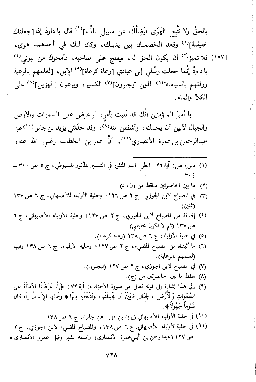 بِالْحَقِّ وَلَا تتبع الْهوى فيضلك عَن سَبِيل الله) قَالَ يَا دَاوُد إِذا جعلناك خَليفَة وَقعد الخصمان بَين يَديك وَكَانَ لَك فِي احدهما هوى فَلَا تميز أَن يكون الْحق لَهُ فيفلج على صَاحبه فأمحوك من نبوتي يَا دَاوُد إِنَّمَا جعلت رُسُلِي إِلَى عبَادي رُعَاة كرعاة الْإِبِل لعلمهم بالرعية ورفقهم بالسياسة الَّذين يجبرون الكسير ويرعون الهزيل على الْكلأ وَالْمَاء