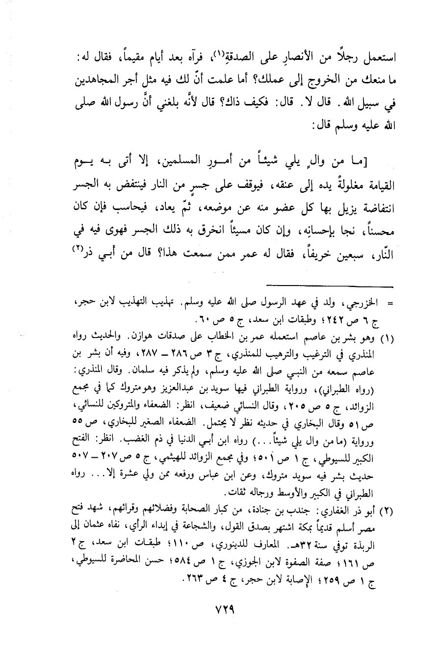 اسْتعْمل رجلا من الْأَنْصَار على الصَّدَقَة فَرَآهُ بعد أَيَّام مُقيما فَقَالَ لَهُ مَا مَنعك من الْخُرُوج إِلَى عَمَلك أما علمت أَن لَك فِيهِ مثل أجر الْمُجَاهدين فِي سَبِيل الله قَالَ لَا قَالَ فَكيف ذَاك قَالَ لِأَنَّهُ بَلغنِي أَن رَسُول الله ص = قَالَ