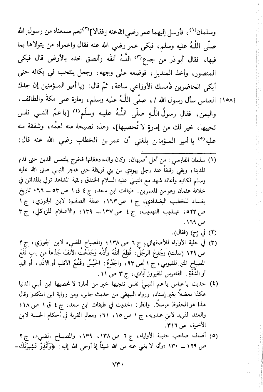 وسلمان فَأرْسل إِلَيْهِمَا عمر رَضِي الله عَنهُ فَقَالَا نعم سمعنَا من رَسُول الله ص = فَبكى عمر رَضِي الله عَنهُ فَقَالَ واعمراه من يتولاها بِمَا فِيهَا فَقَالَ أَبُو ذَر من جدع الله أَنفه والصق خَدّه بِالْأَرْضِ قَالَ فَبكى الْمَنْصُور وَأخذ المنديل فَوَضعه على وَجهه وَجعل ينتحب فِي بكائه حَتَّى أبكى الْحَاضِرين فَأمْسك الْأَوْزَاعِيّ سَاعَة ثمَّ قَالَ يَا أَمِير الْمُؤمنِينَ إِن جدك الْعَبَّاس سَأَلَ رَسُول الله ص = إِمَارَة على مَكَّة والطائف واليمن فَقَالَ رَسُول الله ص = يَا عَم النَّبِي نفس تحييها خير لَك من إِمَارَة لَا تحصيها وَهَذِه نصيحة مِنْهُ لِعَمِّهِ وشفقة مِنْهُ عَلَيْهِ يَا أَمِير الؤمنين بَلغنِي أَن عمر بن الْخطاب رَضِي الله عَنهُ قَالَ