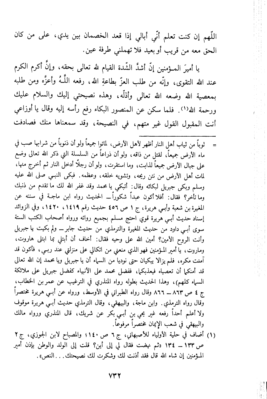 يَا امير الْمُؤمنِينَ إِن أَشد الشدَّة الْقيام لله تَعَالَى بِحقِّهِ وَإِن أكْرم الْكَرم عِنْد الله التَّقْوَى وَإنَّهُ من طلب الْعِزّ بِطَاعَة الله رَفعه الله وأعزه وَمن طلبه بِمَعْصِيَة الله وَضعه الله تَعَالَى وأذله وَهَذِه نصيحتي إِلَيْك وَالسَّلَام عَلَيْك وَرَحْمَة الله فَلَمَّا سكن عَن الْمَنْصُور الْبكاء رفع رَأسه إِلَيْهِ وَقَالَ يَا أوزاعي أَنْت المقبول القَوْل غير مُتَّهم فِي النَّصِيحَة وَقد سمعناها مِنْك فصادفت