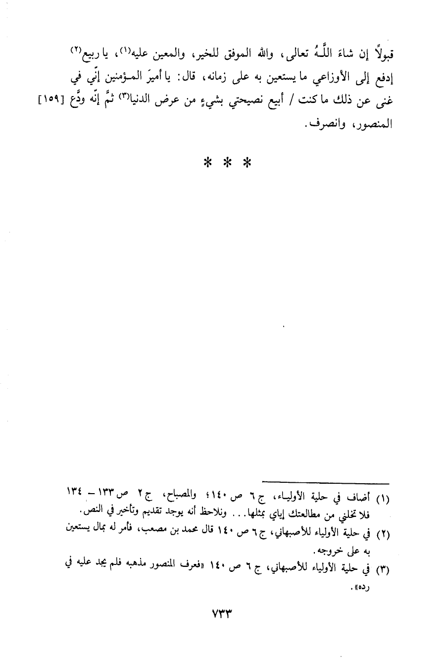 قبولا إِن شَاءَ الله تَعَالَى وَالله الْمُوفق للخير والمعين عَلَيْهِ يَا ربيع إدفع إِلَى الْأَوْزَاعِيّ مَا يَسْتَعِين بِهِ على زَمَانه قَالَ يَا أَمِير الْمُؤمنِينَ إِنِّي فِي غَنِي عَن ذَلِك مَا كنت أبيع نصيحتي بِشَيْء من عرض الدُّنْيَا ثمَّ إِنَّه ودع الْمَنْصُور وَانْصَرف