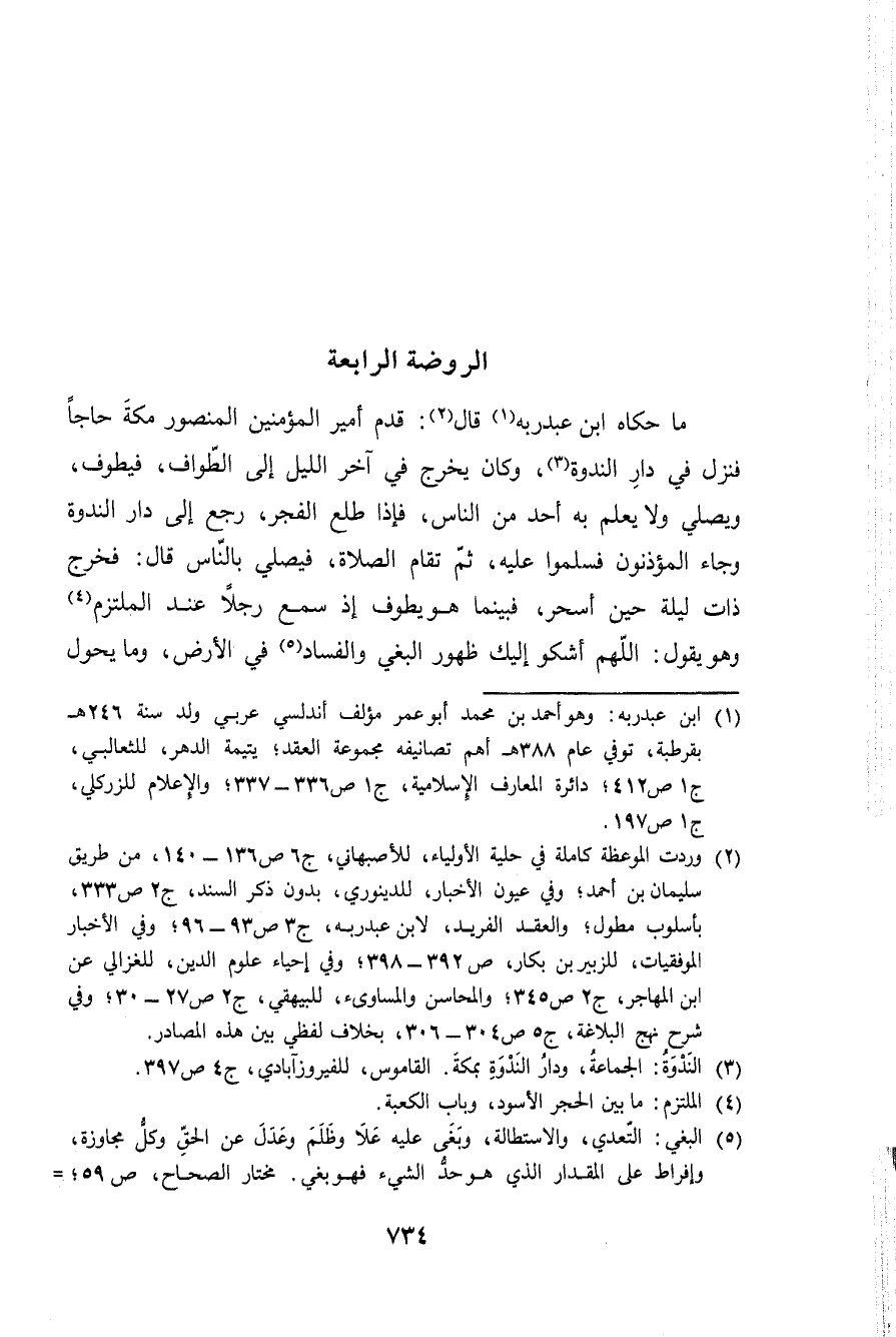 مَا حَكَاهُ ابْن عبد ربه قَالَ قدم أَمِير الْمُؤمنِينَ الْمَنْصُور مَكَّة حَاجا فَنزل فِي دَار الندوة وَكَانَ يخرج فِي آخر اللَّيْل إِلَى الطّواف فيطوف وَيُصلي وَلَا يعلم بِهِ اُحْدُ من النَّاس فَإِذا طلع الْفجْر رَجَعَ إِلَى دَار الندوة وَجَاء المؤذنون فَسَلمُوا عَلَيْهِ ثمَّ تُقَام الصَّلَاة فَيصَلي بِالنَّاسِ قَالَ فَخرج ذَات لَيْلَة حِين أَسحر فَبَيْنَمَا هُوَ يطوف إِذْ سمع رجلا عِنْد الْمُلْتَزم وَهُوَ يَقُول اللَّهُمَّ أَشْكُو إِلَيْك ظُهُور الْبَغي وَالْفساد فِي الأَرْض وَمَا يحول