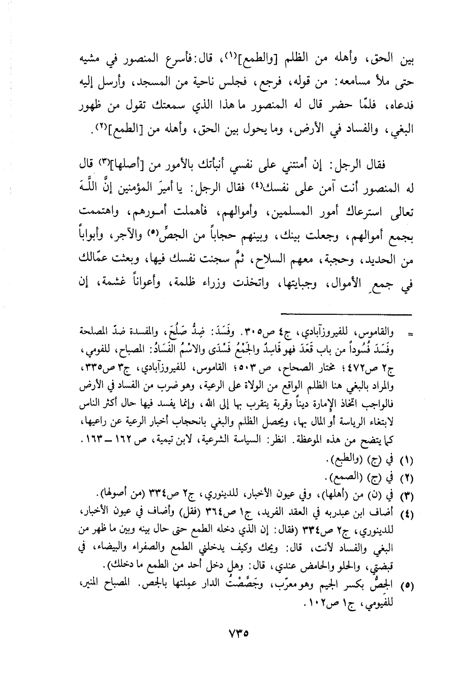 فَقَالَ الرجل إِن أمنتني على نَفسِي أَنْبَأتك بالأمور من أَصْلهَا قَالَ لَهُ الْمَنْصُور أَنْت آمن على نَفسك فَقَالَ الرجل يَا أَمِير الْمُؤمنِينَ إِن الله تَعَالَى استرعاك أُمُور الْمُسلمين وَأَمْوَالهمْ فأهملت أُمُورهم واهتممت بِجمع أَمْوَالهم وَجعلت بَيْنك وَبينهمْ حجاجا من الجص والآجر وأبوابا من الْحَدِيد وحجبة مَعَهم السِّلَاح ثمَّ سجنت نَفسك فِيهَا وَبعثت عمالك فِي جمع الْأَمْوَال وجبايتها واتخذت وزراء ظلمَة وأعوانا غشمة إِن