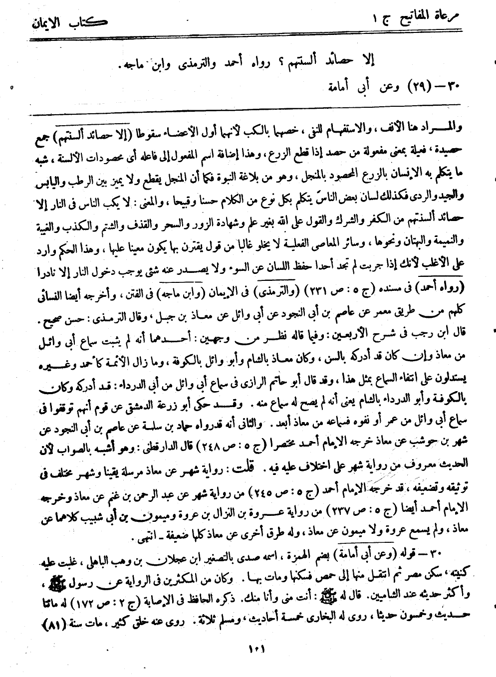 والمراد هنا الأنف، والاستفهام للنفي، خصهما بالكب لأنهما أول الأعضاء سقوطاً (إلا حصائد ألسنتهم) جمع حصيدة، فعيلة بمعنى مفعولة من حصد إذا قطع الزرع، وهذا إضافة اسم المفعول إلى فاعله، أي محصودات الألسنة، شبه ما يتكلم به الإنسان بالزرع المحصود بالمنجل، وهو من بلاغة النبوة، فكما أن المنجل يقطع ولا يميز بين الرطب واليابس والجيد والرديء، فكذلك لسان بعض الناس يتكلم بكل نوع من الكلام حسناً وقبيحاً، والمعنى: لا يكب الناس في النار إلا حصائد ألسنتهم من الكفر والشرك والقول على الله بغير علم وشهادة الزور والسحر والقذف والشتم والكذب والغيبة والنميمة والبهتان ونحوها، وسائر المعاصي الفعلية لا يخلو غالباً من قول يقترن بها يكون معيناً عليها، وهذا الحكم وارد على الأغلب؛ لأنك إذا جربت لم تجد أحداً حفظ اللسان عن السوء ولا يصدر عنه شيء يوجب دخول النار إلا نادراً (رواه أحمد) في مسنده (ج5: ص231) ، (والترمذي) في الإيمان (وابن ماجه) في الفتن، وأخرجه أيضاً النسائي، كلهم من طريق معمر عن عاصم بن أبي النجود عن أبي وائل عن معاذ بن جبل، وقال الترمذي: حسن صحيح، قال ابن رجب في شرح الأربعين: وفيما قاله نظر من وجهين: أحدهما أنه لم يثبت سماع أبي وائل من معاذ وإن كان قد أدركه بالسن، وكان معاذ بالشام وأبووائل بالكوفة، ومازال الأئمة كأحمد وغيره يستدلون على انتفاء السماع بمثل هذا، وقد قال أبوحاتم الرازي في سماع أبي وائل من أبي الدرداء: قد أدركه وكان بالكوفة وأبوالدرداء بالشام يعني أنه لم يصح له سماع منه، وقد حكى أبوزرعة الدمشقي عن قوم أنهم توقفوا في سماع أبي وائل من عمر أو نفوه فسماعه من معاذ أبعد، والثاني: أنه قد رواه حماد بن سلمة عن عاصم بن أبي النجود عن شهر بن حوشب عن معاذ، خرجه الإمام أحمد مختصراً (ج5: ص248) ، قال الدارقطني: وهو أشبه بالصواب؛ لأن الحديث معروف من رواية شهر على اختلاف عليه فيه. قلت: رواية شهر عن معاذ مرسلة يقيناً، وشهر مختلف في توثيقه وتضعيفه، قد خرجه الإمام أحمد (ج5: ص245) من رواية شهر عن عبد الرحمن بن غنم عن معاذ، وخرجه الإمام أحمد أيضاً (ج5: ص237) من رواية عروة بن النَزال بن عروة وميمون بن أبي شبيب كلاهما عن معاذ، ولم يسمع عروة ولا ميمون عن معاذ، وله طرق أخرى عن معاذ كلها ضعيفة – انتهى.