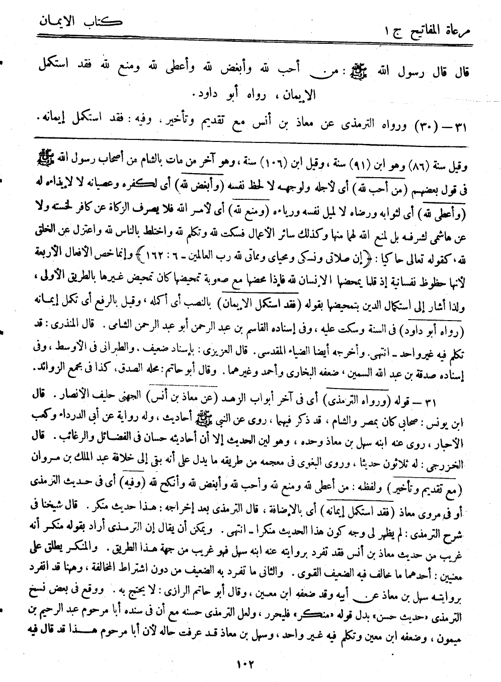 31- قوله: (ورواه الترمذي) أي في آخر أبواب الزهد (عن معاذ بن أنس) الجهني حليف الأنصار، قال ابن يونس: صحابي كان بمصر والشام، قد ذكر فيهما، روى عن النبي - صلى الله عليه وسلم - أحاديث، وله رواية عن أبي الدرداء وكعب الأحبار، روى عنه ابنه سهل بن معاذ وحده، وهو لين الحديث إلا أن أحاديثه حسان في الفضائل والرغائب، قال الخزرجي: له ثلاثون حديثاً، وروى البغوي في معجمه من طريقه ما يدل على أنه بقي إلى خلافة عبد الملك بن مروان. (مع تقديم وتأخير) ولفظه: ((من أعطى لله ومنع لله، وأحب لله وأبغض لله، وأنكح لله)) ، (وفيه) أي في حديث الترمذي أو في مروي معاذ (فقد استكمل إيمانه) أي بالإضافة، قال الترمذي بعد إخراجه: هذا حديث منكر، قال شيخنا في شرح الترمذي: لم يظهر لي وجه كون هذا الحديث منكراً – انتهى. ويمكن أن يقال: إن الترمذي أراد بقوله منكر أنه غريب من حديث معاذ بن أنس، فقد تفرد بروايته عنه ابنه سهل، فهو غريب من جهة هذا الطريق، والمنكر يطلق على معنيين: أحدهما ما خالف فيه الضعيف القوي، والثاني ما تفرد به الضعيف من دون اشتراط المخالفة، وهاهنا قد انفرد بروايته سهل بن معاذ عن أبيه، وقد ضعفه ابن معين، وقال أبوحاتم الرازي: لا يحتج به، ووقع في بعض نسخ الترمذي: "حديث حسن"، بدل قوله "منكر" فليحرر، ولعل الترمذي حسنه مع أن في سنده أبامرحوم عبد الرحيم بن ميمون، وضعفه ابن معين وتكلم فيه غير واحد، وسهل بن معاذ قد عرفت حاله؛ لأن أبامرحوم هذا قد قال فيه