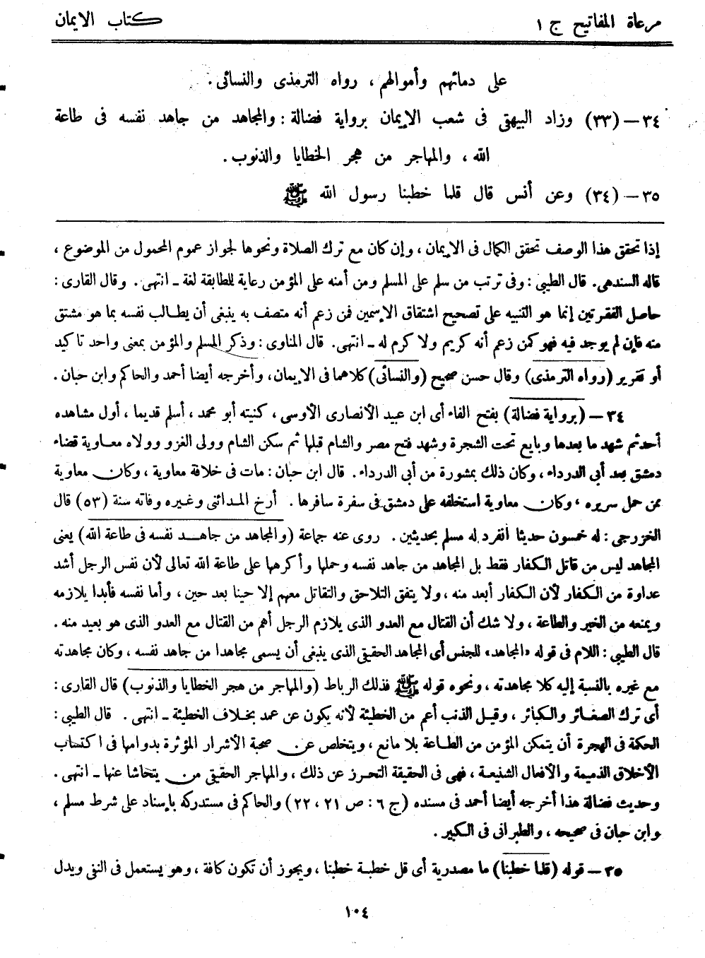 34- (33) وزاد البيهقي في شعب الإيمان برواية فضالة: ((والمجاهد من جاهد نفسه في طاعة الله، والمهاجر من هجر الخطايا والذنوب)) .