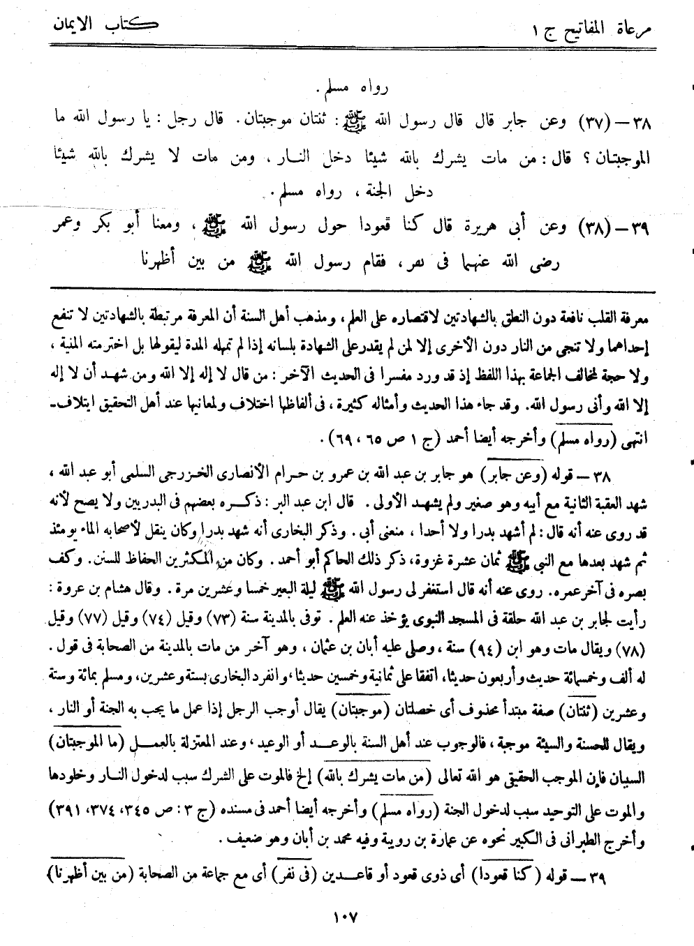 38- (37) وعن جابر قال: قال رسول الله - صلى الله عليه وسلم -: ((ثنتان موجبتان، قال رجل: يا رسول الله ما الموجبتان؟ قال: من مات يشرك بالله شيئاً دخل النار، ومن مات لا يشرك بالله شيئاً دخل الجنة)) ، رواه مسلم.