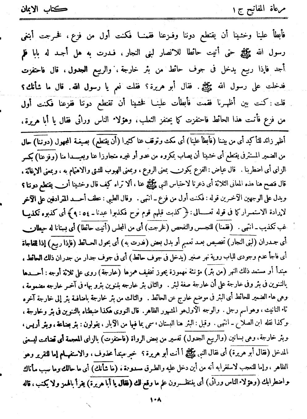 أظهر زائدة للتأكيد أي من بيننا (فأبطأ علينا) أي مكث وتوقف عنا كثيراً (أن يقتطع) بصيغة المجهول (دوننا) حال من الضمير المستتر في يقتطع، أي خشينا أن يصاب بمكروه من عدو أو غيره متجاوزاً عنا وبعيداً منا (وفزعنا) بكسر الزاي أي اضطربنا. قال عياض: الفزع يكون بمعنى الروع، وبمعنى الهبوب للشيء والاهتمام به، وبمعنى الإغاثة، قال فتصح هنا هذه المعاني الثلاثة أي ذعرنا لاحتباس النبي - صلى الله عليه وسلم - عنا، ألا تراه كيف قال: وخشينا أن يقتطع دوننا؟ ويدل على الوجهين الآخرين قوله: فكنت أول من فزع – انتهى. وقال الطيبي: عطف أحد المترادفين على الآخر لإرادة الاستمرار كما في قوله تعالى: {كذبت قبلهم قوم نوح فكذبوا عبدنا} [54: 9] ، أي كذبوه تكذيباً غب تكذيب – انتهى. (فقمنا) للتجسس والتحفص (فخرجت) أي من المجلس (أتيت حائطاً) أي بستاناً له حيطان أي جدران (لبني النجار) تخصيص بعد تعميم أو بدل بعض (فدرت به) أي بحول الحائط (فإذا ربيع) إذا للمفاجأة أي فاجأ عدم وجودي للباب روية نهر صغير (يدخل في جوف حائط) أي في جوف جداًر من جدران ذلك الحائط، مبتدأ أو مستمد ذلك النهر (من بئر) مؤنثة مهموزة يجوز تخفيف همزها (خارجة) روي على ثلاثة أوجه: أحدها بالتنوين في بئر وفي خارجة على أن خارجة صفة لبئر، والثاني بئر خارجة بتنوين بئر وبهاء في آخر خارجه مضمومة، وهي هاء الضمير للحائط أي البئر في موضع خارج عن الحائط، والثالث من بئر خارجة بإضافة بئر إلى خارجة آخره تاء التأنيث، وهو اسم رجل، والوجه الأول هو المشهور الظاهر، قال النووي: هكذا ضبطناه بالتنوين في بئر وخارجة، وكذا نقله ابن الصلاح – انتهى. وقيل: البئر هنا البستان، سمي بما فيها من الآبار، يقولون: بئر بضاعة، وبئر أريس، وبئر خارجة، وهي بساتين. (والربيع الجدول) تفسير من بعض الرواة (فاحتفزت) بالزاي المعجمة أي تضاممت ليسعني المدخل (فقال: أبوهريرة؟) أي فقال النبي - صلى الله عليه وسلم - أأنت أبوهريرة؟ خبر مبتدأ محذوف، والاستفهام إما للتقرير وهو الظاهر، وإما للتعجب لاستغرابه أنه من أين دخل عليه والطرق مسدودة (ما شأنك) أي ما حالك وما سبب مأتاك واضطرابك؟ (وهؤلاء الناس ورائي) أي ينتظرون علم ما وقع لك (فقال: يا أباهريرة) يقرأ بالهمز ولا يكتب، قاله