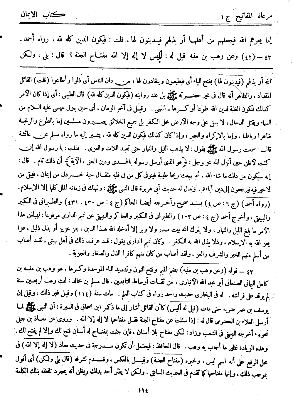 43- قوله: (وعن وهب بن منبه) بضم الميم وفتح النون وتشديد الباء الموحدة وكسرها، هو وهب بن منبه بن كامل اليماني الصنعاني أبوعبد الله الأنباري، من ثقات أوساط التابعين، قال مسلم بن خالد: لبث وهب أربعين سنة لم يرقد على فراشه، له في البخاري حديث واحد، رواه في كتاب العلم، مات سنة (114) ، وقيل غير ذلك، وقيل: إن يوسف بن عمر ضربه حتى مات. (قيل له: أليس) كأن القائل أشار إلى ما ذكر ابن إسحاق في السيرة: أن النبي - صلى الله عليه وسلم - لما أرسل العلاء بن الحضرمي قال له: ((إذا سئلت عن مفتاح الجنة فقل: مفتاحها لا إله إلا الله)) ، وروي عن معاذ بن جبل نحوه، أخرجه البيهقي في الشعب وزاد: "لكن مفتاح بلا أسنان، فإن جئت بمفتاح له أسنان فتح لك، وإلا لم يفتح لك"، وهذه الزيادة نظير ما أجاب به وهب، قال الحافظ: فيحتمل أن تكون مدرجة في حديث معاذ. (لا إله إلا الله) في محل الرفع على أنه اسم ليس، وخبره (مفتاح الجنة) ، وقيل بالعكس، وقدم لشرفه (قال: بلى، ولكن) أي أقول بموجب ذلك، وإنها مفتاحها كما تقدم في الحديث السابق، ولكن لا يغتر أحد بذلك ويظن أنه بمجرد تلفظه بتلك الكلمة