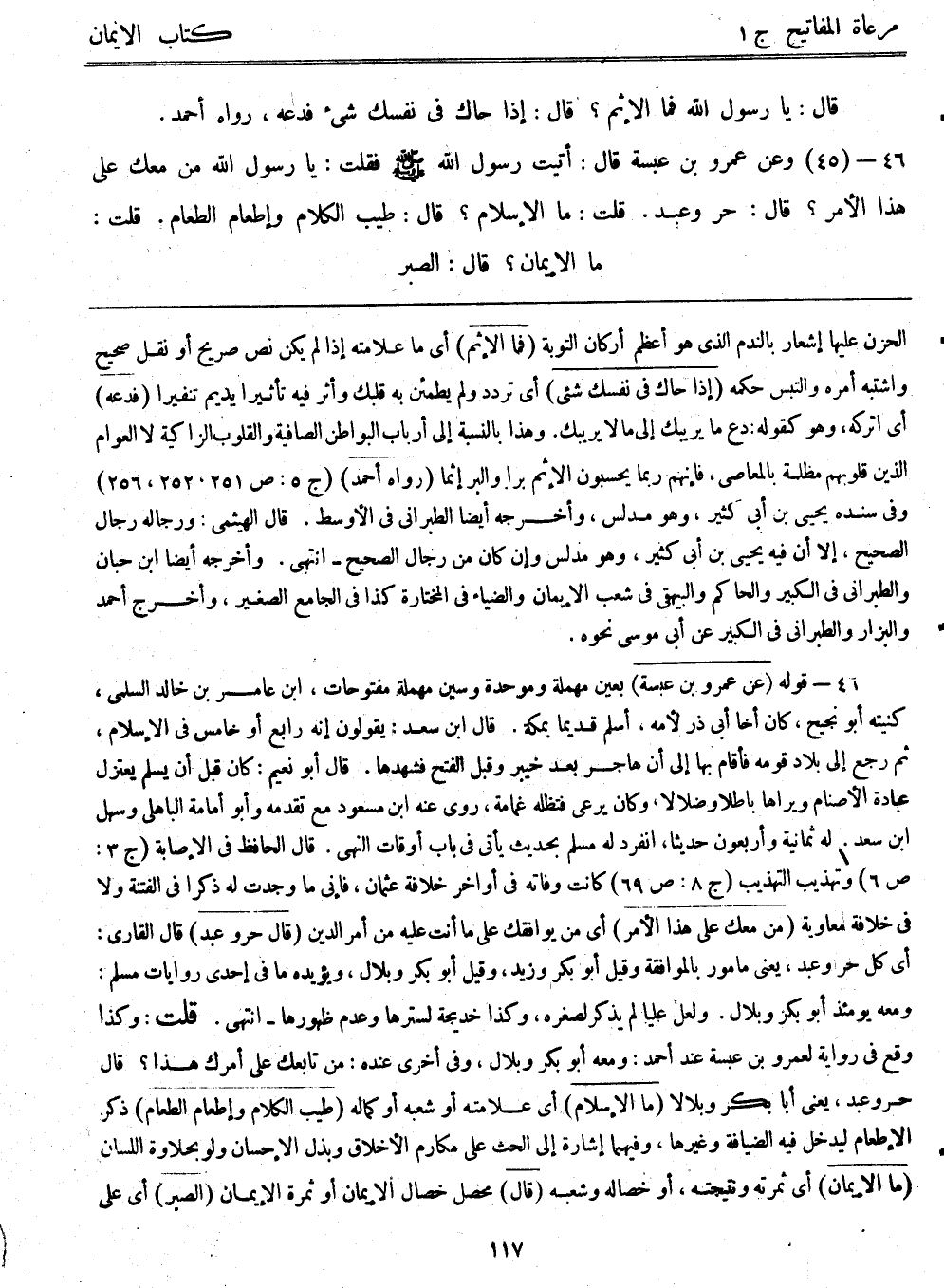 46- (45) وعن عمرو بن عبسة قال: أتيت رسول الله - صلى الله عليه وسلم - فقلت: يا رسول الله من معك على هذا الأمر؟ قال: حر وعبد، قلت: ما الإسلام؟ قال: طيب الكلام وإطعام الطعام، قلت: ما الإيمان؟ قال: الصبر