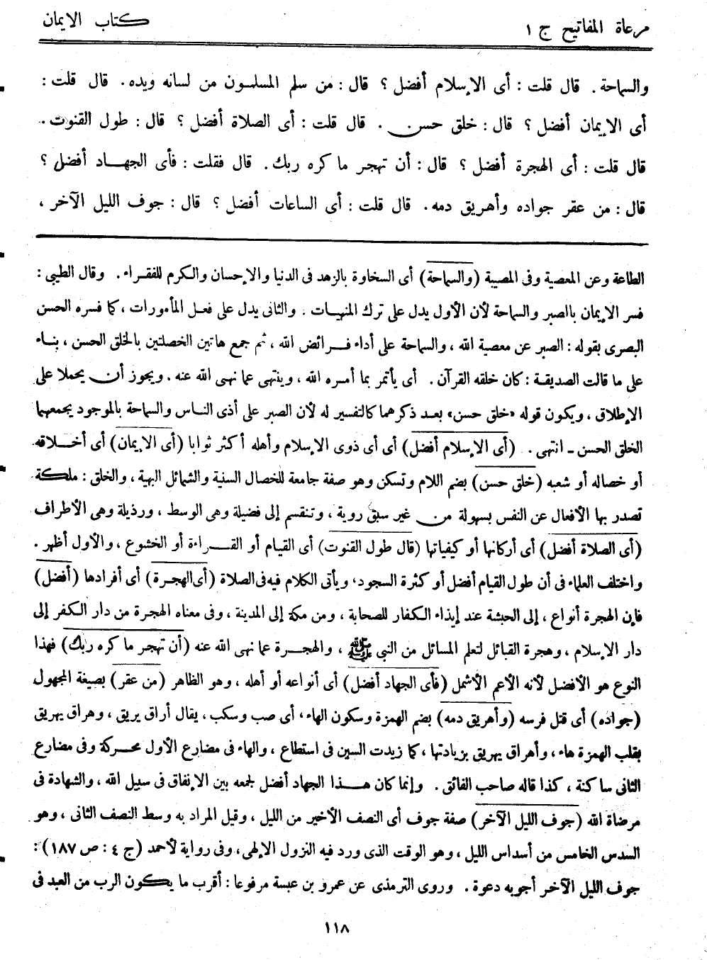 الطاعة وعن المعصية وفي المعصية (والسماحة) أي السخاوة بالزهد في الدنيا والإحسان والكرم للفقراء، وقال الطيبي: فسر الإيمان بالصبر والسماحة لأن الأول يدل على ترك المنهيات، والثاني يدل على فعل المأمورات، كما فسره الحسن البصري بقوله: الصبر عن معصية الله، والسماحة على أداء فرائض الله، ثم جمع هاتين الخصلتين بالخلق الحسن، بناءً على ما قالت الصديقة: ((كان خلقه القرآن)) ، أي يأتمر بما أمره الله، وينتهي عما نهى الله عنه، ويجوز أن يحملا على الإطلاق، ويكون قوله ((خلق حسن)) بعد ذكرهما كالتفسير له؛ لأن الصبر على أذى الناس والسماحة بالموجود يجمعهما الخلق الحسن - انتهى. (أي الإسلام أفضل) أي أيّ ذوي الإسلام وأهله أكثر ثواباً (أي الإيمان) أي أخلاقه أو خصاله أو شعبه (خلق حسن) بضم اللام وتسكن، وهو صفة جامعة للخصال السنية والشمائل البهية، والخلق: ملكة تصدر بها الأفعال عن النفس بسهولة من غير سبق روية، وتنقسم إلى فضيلة وهي الوسط، ورذيلة وهي الأطراف. (أي الصلاة أفضل) أي أركانها أو كيفياتها (قال: طول القنوت) أي القيام أو القراءة أو الخشوع، والأول أظهر. واختلف العلماء في أن طول القيام أفضل أو كثرة السجود، ويأتي الكلام فيه في الصلاة (أي الهجرة) أي أفرادها (أفضل) فإن الهجرة أنواع، إلى الحبشة عند إيذاء الكفارة للصحابة، ومن مكة إلى المدينة، وفي معناه الهجرة من دار الكفر إلى دار الإسلام، وهجرة القبائل لتعلم المسائل من النبي - صلى الله عليه وسلم -، والهجرة عما نهى الله عنه (أن تهجر ما كره ربك) فهذا النوع هو الأفضل؛ لأنه الأعم الأشمل (فأي الجهاد أفضل) أي أنواعه أو أهله، وهو الظاهر (من عقر) بصيغة المجهول (جواده) أي قتل فرسه (وأهريق دمه) بضم الهمزة وسكون الهاء، أي صب وسكب، يقال: أراق يريق، وهراق يهريق، بقلب الهمزة هاء، وأهراق يهريق بزيادتها، كما زيدت السين في استطاع، والهاء في مضارع الأول محركة وفي مضارع الثاني ساكنة، كذا قاله صاحب الفائق. وإنما كان هذا الجهاد أفضل لجمعه بين الإنفاق في سبيل الله، والشهادة في مرضاة الله (جوف الليل الآخر) صفة جوف أي النصف الأخير من الليل، وقيل: المراد به وسط النصف الثاني، وهو السدس الخامس من أسداس الليل، وهو الوقت الذي ورد فيه النُزول الإلهي، وفي رواية لأحمد (ج4: ص187) : ((جوف الليل الآخر أجوبه دعوة)) ، وروى الترمذي عن عمرو بن عبسة مرفوعاً: ((أقرب ما يكون الرب من العبد في