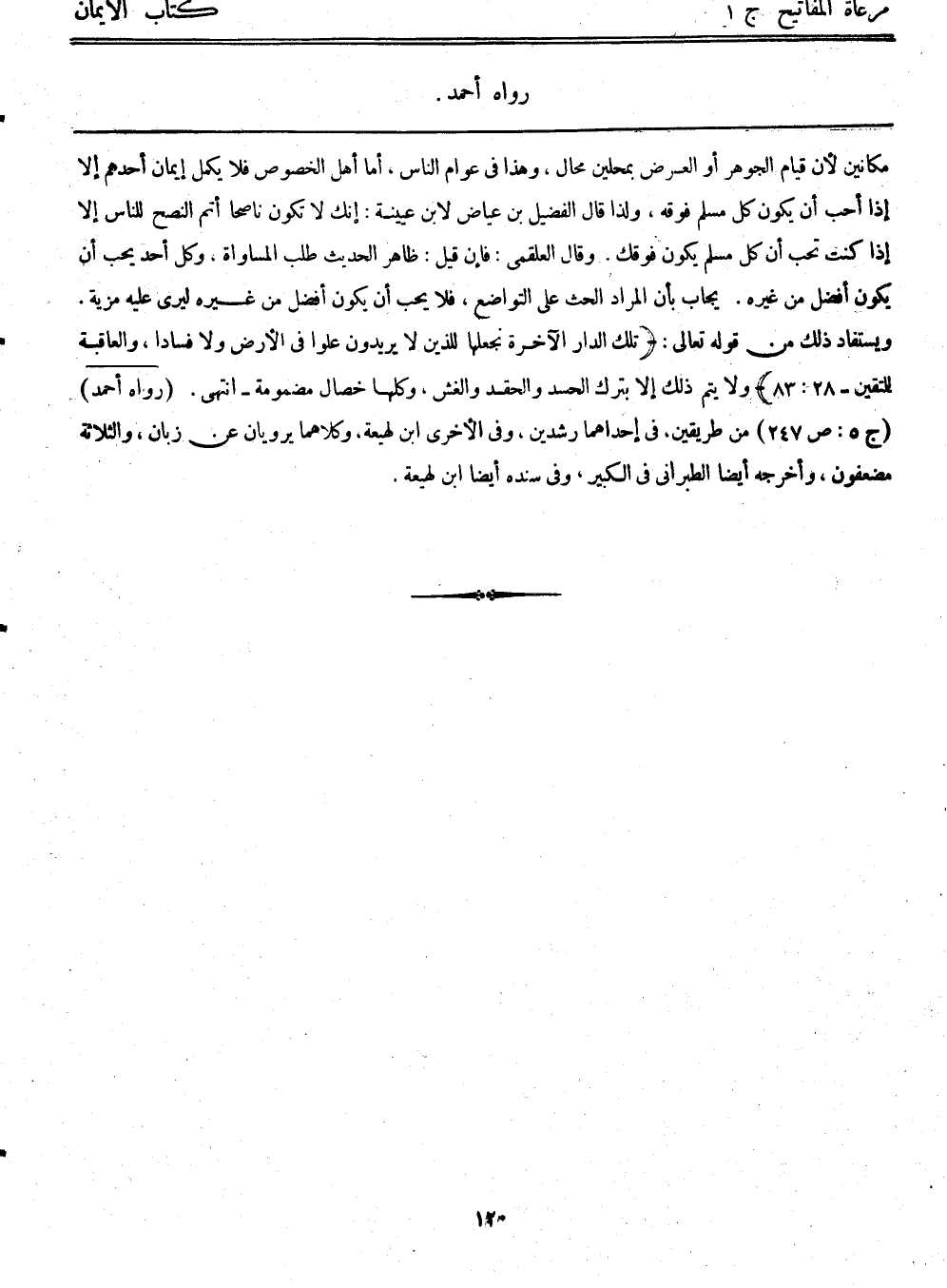 مكانين؛ لأن قيام الجوهر أو العرض بمحلين محال، وهذا في عوام الناس، أما أهل الخصوص فلا يكمل إيمان أحدهم إلا إذا أحب أن يكون كل مسلم فوقه، ولذا قال الفضيل بن عياض لابن عيينة: إنك لا تكون ناصحاً أتم النصح للناس إلا إذا كنت تحب أن كل مسلم يكون فوقك. وقال العلقمى: فإن قيل: ظاهر الحديث طلب المساواة، وكل أحد يحب أن يكون أفضل من غيره. يجاب بأن المراد الحث على التواضح، فلا يحب أن يكون أفضل من غيره ليرى عليه مزية. ويستفاد ذلك من قوله تعالى: {تلك الدار الآخرة نجعلها للذين لا يريدون علواً في الأرض ولا فساداً والعاقبة للمتقين} [28: 83] ، ولا يتم ذلك إلا بترك الحسد والحقد والغش، وكلها خصال مذمومة - انتهى. (رواه أحمد) (ج5: ص247) من طريقين، في أحداًهما رشدين، وفي الأخرى ابن لهيعة، وكلاهما يرويان عن زبان، والثلاثة مضعّفون، وأخرجه أيضاً الطبراني في الكبير، وفي سنده أيضاً ابن لهيعة.