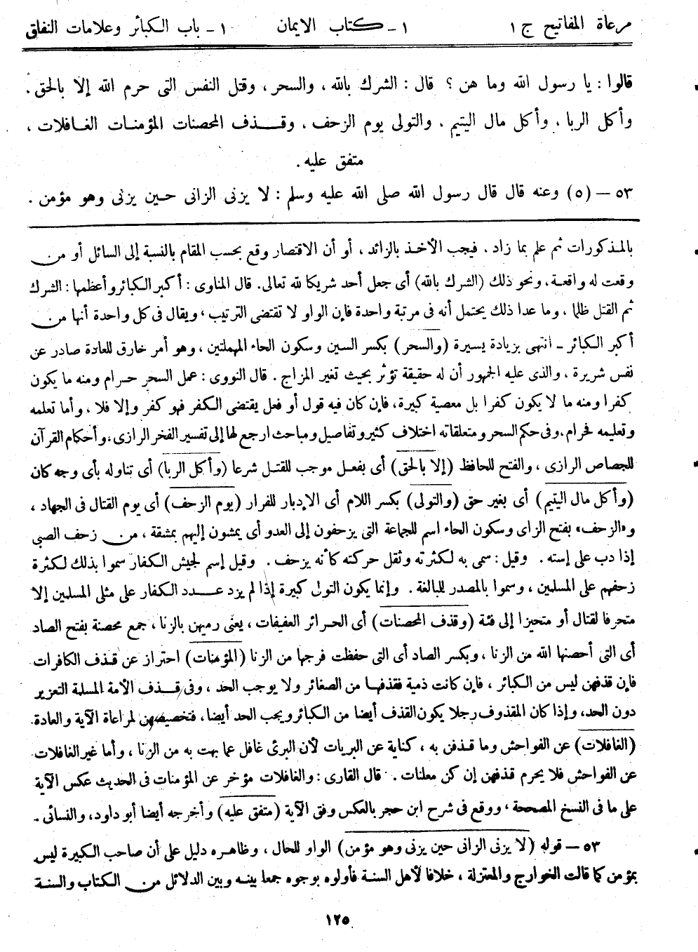 53- قوله: (لايزني الزاني حين يزني وهو مؤمن) الواو للحال، وظاهره دليل على أن صاحب الكبيرة ليس بمؤمن كما قالت الخوارج والمعتزلة، خلافاً لأهل السنة فأوله بوجوه جمعاً بينه وبين الدلائل من الكتاب والسنة.