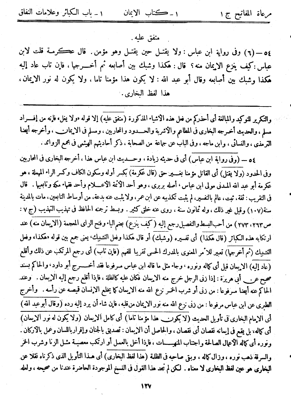 54- (6) وفي رواية ابن عباس: ((ولا يقتل حين يقتل وهو مؤمن)) . قال عكرمة: قلت لابن عباس: كيف ينزع الإيمان منه؟ قال: هكذا، وشبك بين أصابعه ثم أخرجها، فإن تاب عاد إليه هكذا، وشبك بين أصابعه، وقال أبوعبد الله: لا يكون هذا مؤمناً تاماً، ولا يكون له نور الإيمان، هذا لفظ البخاري.