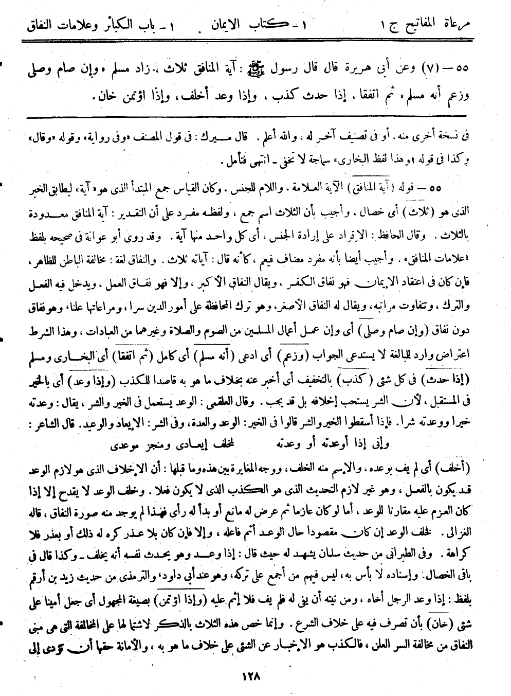 55-قوله: (آية المنافق) الآية العلامة، واللام للجنس، وكان القياس جمع المبتدأ الذي هو" الآية" ليطابق الخير الذي هو (ثلاث) أي خصال، وأجيب بأن الثلاث اسم جمع، ولفظه مفرد على أن التقدير: آية المنافق معدودة بالثلاث. وقال الحافظ: الإفراد على إرادة الجنس، أي كل واحد منها آية. وقد روى أبوعوانه في صحيحه بلفظ ((علامات المنافق)) ، وأجيب أيضاً بأنه مفرد مضاف فيعم، كأنه قال: آياته ثلاث. والنفاق لغة: مخالفة الباطن للظاهر، فإن كان في اعتقاد الإيمان فهو نفاق الكفر، ويقال النفاق الأكبر، وإلا فهو نفاق العمل، ويدخل فيه الفعل والترك، وتفاوت مراتبه، ويقال له: النفاق الأصغر، وهو ترك المحافظة على أمور الدين سراً، ومراعاتها علناً، وهو نفاق دون نفاق. (وإن صام وصلى) أي وإن عمل أعمال المسلمين من الصوم والصلاة وغيرهما من العبادات، وهذا الشرط اعتراض وارد للمبالغة لا يستدعى الجواب. (وزعم) أي ادعى (أنه مسلم) أي كامل (ثم اتفقا) أي البخاري ومسلم (إذا حدث) في كل شيء (كذب) بالتخفيف أي أخبر عنه بخلاف ما هو به قاصداً للكذب. (وإذا وعد) أي بالخير في المستقبل؛ لأن الشر يستحب إخلافه، بل قد يجيب. وقال العلقمي: الوعد يستعمل في الخير والشر، يقال: وعدته خيراً ووعدته شراً. فإذا أسقطوا الخير والشر قالوا في الخير: الوعد والعدة، وفي الشر: الإبعاد والوعيد. قال الشاعر: