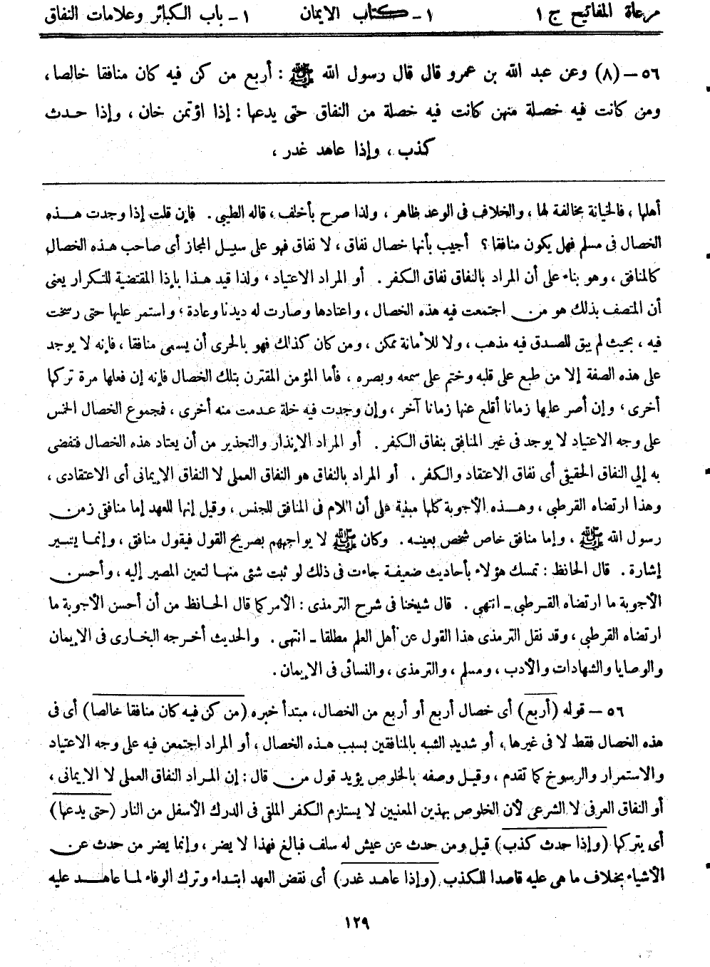 56- قوله: (أربع) أي خصال أربع، أو أربع من الخصال مبتدأ، خبره (من كن فيه كان منافقاً خالصاً) أي في هذه الخصال فقط لا في غيرها، أو شديد الشبه بالمنافقين بسبب هذه الخصال، أو المراد اجتمعن فيه على وجه الاعتياد والاستمرار والرسوخ كما تقدم، وقيل وصفه بالخلوص، يؤيد قول من قال: إن المراد النفاق العملي لا الإيماني، أو النفاق العرفي لا الشرعي؛ لأن الخلوص بهذين المعنيين لا يستلزم الكفر الملقي في الدرك الأسفل من النار. (حتى يدعها) أي يتركها (وإذا حدث كذب) قيل: ومن حدث عن عيش له سلف فبالغ فهذا لا يضر، وإنما يضر من حدث عن الأشياء بخلاف ما هي عليه قاصداً للكذب. (وإذا عاهد غدر) أي نقض العهد ابتدأ وترك الوفاء لما عاهد عليه
