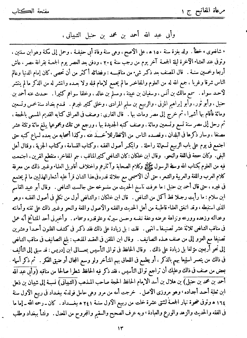 "شافعوي" خطأ، ولد بغزة سنة 150هـ، على الأصح، وهي سنة وفاة أبي حنيفة، وحمل إلى مكة وهو ابن سنتين، وتوفي عند العشاء الآخر ليلة الجمعة آخر يوم من رجب سنة 204، ودفن بعد العصر يوم الجمعة بقرافة مصر، عاش أربعاً وخمسين سنة، قال المصنف بعد ذكر شيء من مناقبه: وفضائله أكثر من أن تحصى، كان إمام الدنيا وعالم الناس شرقاً وغرباً، جمع الله له من العلوم والمفاخر ما لم يجمع لإمام قبله ولا بعده، وانتشر له من الذكر ما لم ينتشر لأحد سواه، سمع مالك بن أنس، وسفيان بن عيينة، ومسلم بن خالد، وخلقاً سواهم كثيراً، حدث عنه أحمد بن حنبل، وأبوثور، وأبوإبراهيم المزني، والربيع بن سليم المرادي، وخلق كثير غيرهم، قدم بغداد سنة خمس وتسعين ومائة فأقام بها أشهراً، ثم خرج إلى مصر ومات بها، قال القاري: وصنف في العراق كتابه القديم المسمى بالحجة، ثم رحل إلى مصر سنة تسع وتسعين ومائة، وصنف كتبه الجديدة بها، ورجع عن تلك ومجموعها يبلغ مائة وثلاثة عشر مصنفاً، وسار ذكرها في البلدان، وقصده الناس من الأقطار للأخذ عنه، وكذا أصحابه من بعده لسماع كتبه حتى اجتمع في يوم على باب الربيع تسعمائة راحلة، وابتكر أصول الفقه، وكتاب القسامة، وكتاب الجزية، وقتال أهل البغي، وكان حجة في اللغة والنحو. وقال ابن خلكان: كان الشافعي كثير المناقب، جم المفاخر، منقطع القرين، اجتمعت فيه من العلوم بكتاب الله وسنة الرسول - صلى الله عليه وسلم - وكلام الصحابة وآثارهم واختلاف أقاويل العلماء وغير ذلك من معرفة كلام العرب واللغة العربية والشعر، حتى أن الأصمعي مع جلالة قدره في هذا الشأن قرأ عليه أشعار الهذليين ما لم يجتمع في غيره، حتى قال أحمد بن حنبل: ما عرفت ناسخ الحديث من منسوخه حتى جالست الشافعي. وقال أبوعبيد القاسم بن سلام: ما رأيت رجلاً قط أكمل من الشافعي، قال ابن خلكان: والشافعي أول من تكلم في أصول الفقه، وهو الذي استنبطه، وقد اتفق العلماء قاطبة من أهل الحديث والفقه والأصول واللغة والنحو وغير ذلك على ثقته وأمانته وعدالته وزهده وورعه ونزاهة عرضه وعفة نفسه وحسن سيرته وعلو قدره وسخائه. وأخبرني أحد المشايخ أنه عمل في مناقب الشافعي ثلاثة عشر تصنيفاً - انتهى. قلت: بل زيادة على ذلك فقد ذكر في كشف الظنون أحداً وعشرين تصنيفاً مع العزو إلى من صنف هذه التصانيف. وقال ابن الملقن في العقد المذهب: بلغ التصانيف في مناقب الشافعي إلى نحو أربعين مؤلفاً بل زيادة على ذلك، وقال الحافظ في توالي التأسيس بمعالي ابن إدريس: قد سبق إلى التأليف في ذلك من يتعسر استيعابهم بالذكر، أو يطمع في اللحاق بهم المتأخر ولو وسع المجال أو ضيق الفكر، ثم ذكر أسماء بعض من صنف في ذلك، وعليك أن تراجع توالي التأسيس، فقد ذكر فيه الحافظ شطراً صالحاً من مناقبه. (وأبي عبد الله أحمد بن محمد بن حنبل) بن هلال بن أسد الإمام الحافظ الحجة صاحب المذهب (الشيباني) نسبة إلى شيبان بن ذهل بن ثعلبة أحد أجداده، وهو مروزي الأصل، خرجت أمه من مرو وهي حامل فولدته ببغداد في ربيع الأول سنة 164هـ، وتوفي ضحوة نهار الجمعة لاثنتي عشرة خلت من ربيع الأول سنة 241هـ ببغداد، كان - رحمه الله - إماماً في الفقه والحديث والزهد والورع والعبادة، وبه عرف الصحيح والسقيم والمجروح من المعدل، ونشأ ببغداد وطلب
