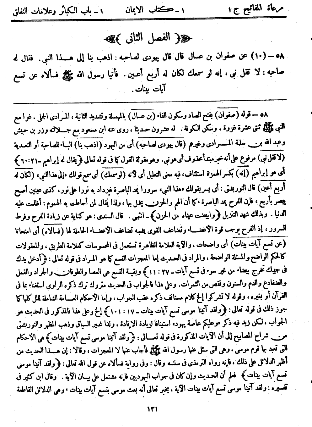 58- (10) عن صفوان بن عسال قال: قال يهودي لصاحبه: اذهب بنا إلى هذا النبي، فقال له صاحبه: لا تقل نبي، إنه لو سمعك لكان له أربع أعين، فأتيا رسول الله - صلى الله عليه وسلم - فسألاه عن تسع آيات بينات.