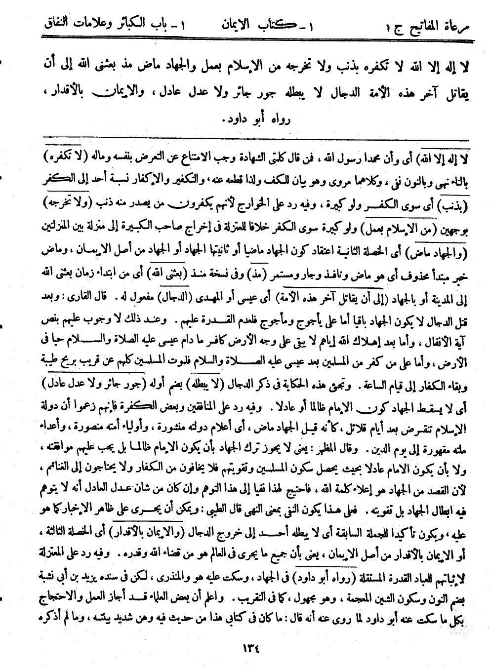 لا إله إلا الله لا تكفره بذنب ولا تخرجه من الإسلام بعمل، والجهاد ماضٍ مذ بعثني الله إلى أن يقاتل آخر هذه الأمة الدجال، لا يبطله جور جائر ولا عدل عادل، والإيمان بالأقدار)) ، رواه أبو داود.