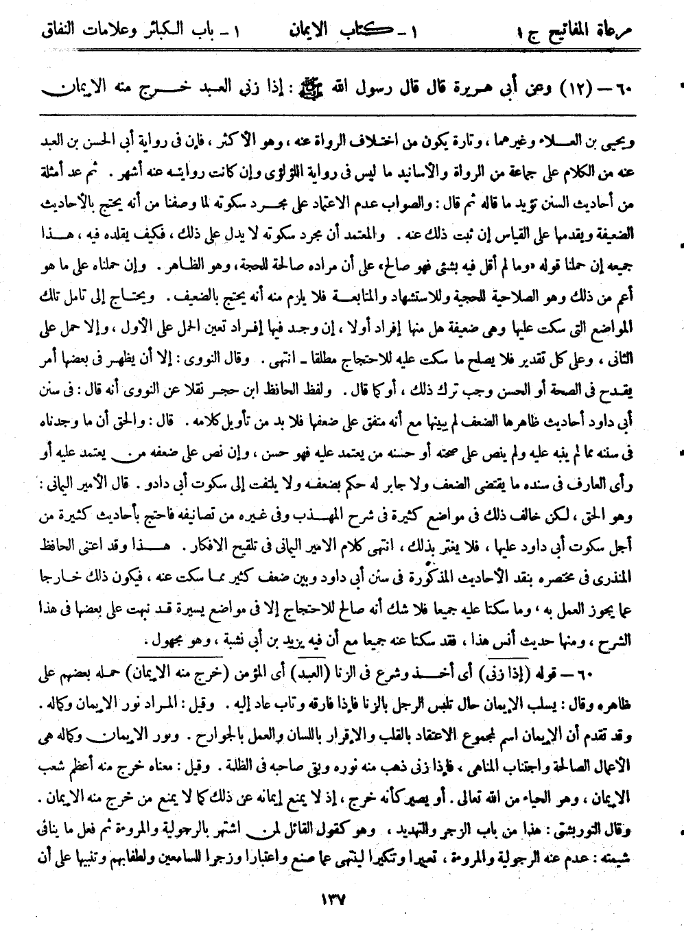 60- قوله: (إذا زنى) أي أخذ وشرع في الزنا (العبد) أي المؤمن (خرج منه الإيمان) حمله بعضهم على ظاهرة وقال: يسلب الإيمان حال تلبس الرجل بالزنا، فإذا فارقه وتاب عاد إليه. وقيل: المراد نور الإيمان وكماله. وقد تقدم أن الإيمان اسم لمجموع الاعتقاد بالقلب والإقرار باللسان والعمل بالجوارح. ونور الإيمان وكماله هي الأعمال الصالحة واجتناب المناهي، فإذا زنى ذهب منه نوره وبقي صاحبه في الظلمة. وقيل: معناه خرج منه أعظم شعب الإيمان، وهو الحياء من الله تعالى. أو يصير كأنه خرج، إذ لا يمنع إيمانه عن ذلك كما لا يمنع من خرج منه الإيمان. وقال التوربشتي: هذا من باب الزجر والتهديد، وهو كقول القائل لمن اشتهر بالرجولية والمروءة ثم فعل ما ينافي شيمته: عدم عند الرجولية والمروءة، تعييراً أو تنكيراً لينتهي عما صنع، واعتباراً وزجراً للسامعين لطفا بهم، وتنبيهاً على أن