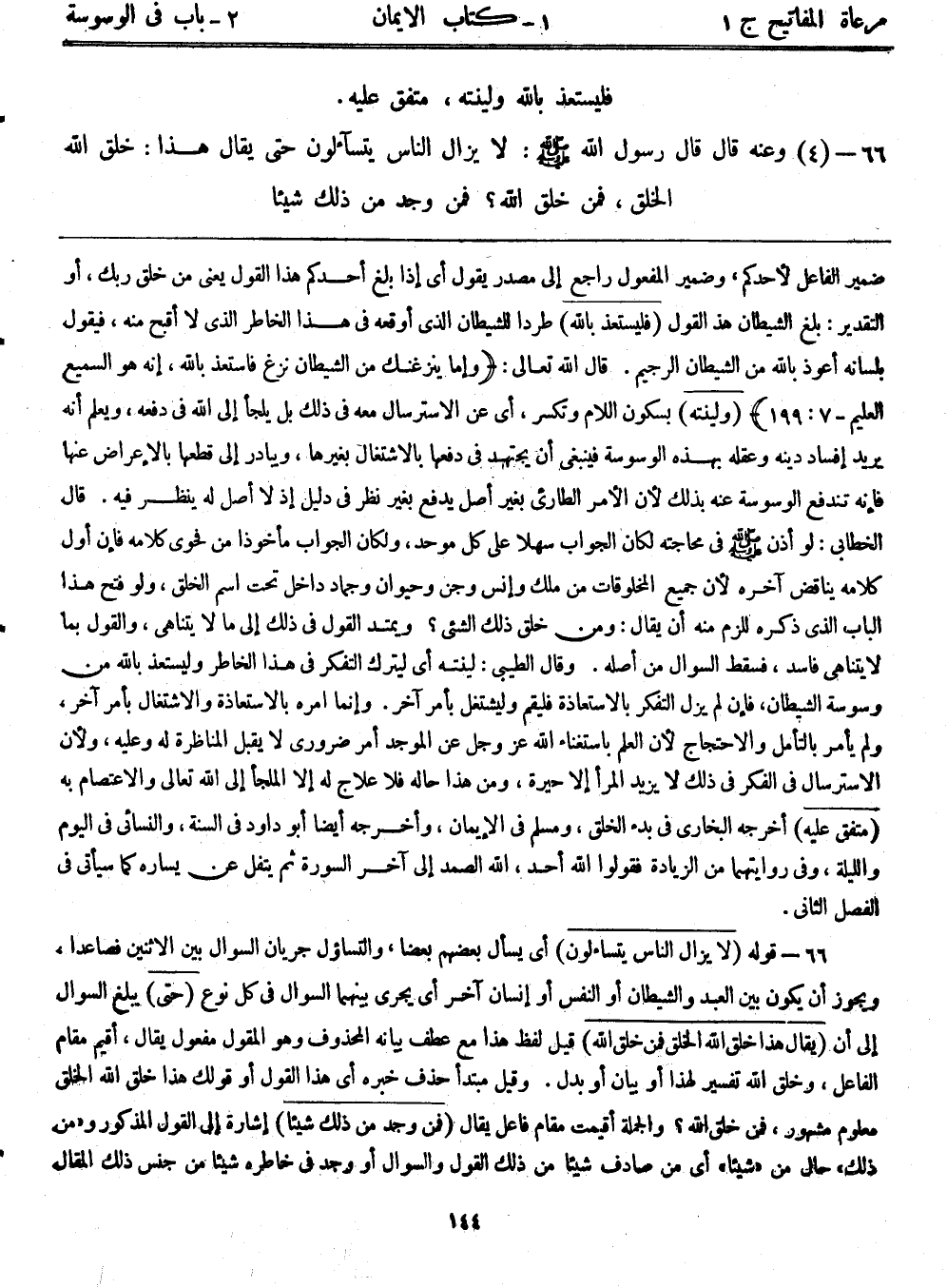 ضمير الفاعل لأحدكم، وضمير المفعول راجع إلى مصدر يقول، أي إذا بلغ أحدكم هذا القول، يعني من خلق ربك، أو التقدير: بلغ الشيطان هذا القول. (فليستعذ بالله) طرداً للشيطان الذي أوقعه في هذا الخاطر الذي لا أقبح منه، فيقول بلسانه: أعوذ بالله من الشيطان الرجيم. قال الله تعالى: {وإما ينزغنك من الشيطان نزغ فاستعذ بالله إنه هو السميع العليم} [7: 199] . (ولينته) بسكون اللام وتكسر، أي عن الاسترسال معه في ذلك، بل يلجأ إلى الله في دفعه، ويعلم أنه يريد إفساد دينه وعقله بهذه الوسوسة، فينبغي أن يجتهد في دفعها بالاشتغال بغيرها، ويبادر إلى قطعها بالإعراض عنها، فإنه تندفع الوسوسة عنه بذلك؛ لأن الأمر الطارئ بغير أصل يدفع بغير نظر في دليل، إذ لا أصل له ينظر فيه، قال الخطابي: لو أذن - صلى الله عليه وسلم - في محاجته لكان الجواب سهلاً على كل موحد، ولكان الجواب مأخوذاً من فحوى كلامه، فإن أول كلامه يناقض آخره؛ لأن جميع المخلوقات من ملك وإنس وجن وحيوان وجماد داخل تحت اسم الخلق، ولو فتح هذا الباب الذي ذكره للزم منه أن يقال: ومن خلق ذلك الشيء؟ ويمتد القول في ذلك إلى ما لا يتناهى، والقول بما لا يتناهى فاسد، فسقط السؤال من أصله، وقال الطيبي: لينته، أي ليترك التفكر في هذا الخاطر، وليستعذ بالله من وسوسة الشيطان، فإن لم يزل التفكر بالاستعاذة فليقم وليشتغل بأمر آخر، وإنما أمره بالاستعاذة والاشتغال بأمر آخر، ولم يأمر بالتأمل والاحتجاج؛ لأن العلم باستغناء الله عزوجل عن الموجد أمر ضروري لا يقبل المناظرة له وعليه، ولأن الاسترسال في الفكر في ذلك لا يزيد المرء إلى حيرة، ومن هذا حاله فلا علاج له إلا الملجأ إلى الله تعالى والاعتصام به. (متفق عليه) أخرجه البخاري في بدء الخلق، ومسلم في الإيمان، وأخرجه أيضاً أبوداود في السنة، والنسائي في اليوم والليلة، وفي روايتهما من الزيادة ((فقولوا الله أحد، الله الصمد ... )) إلى آخر السورة، ثم يتفل عن يساره، كما سيأتي في الفصل الثاني.