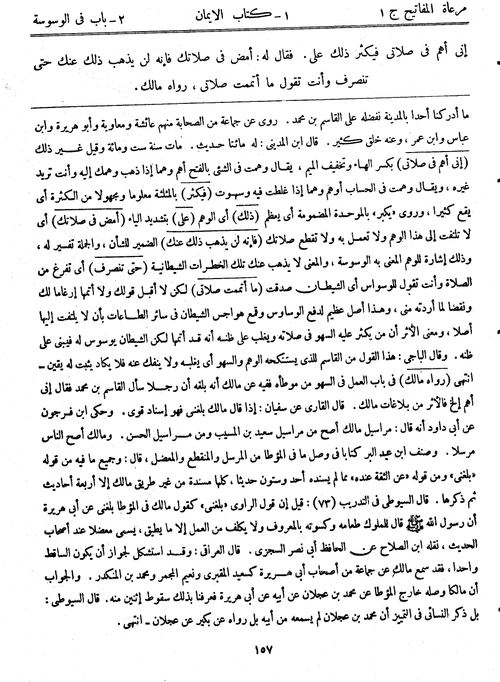 ما أدركنا أحداً بالمدينة نفضله على القاسم بن محمد. روى عن جماعة من الصحابة منهم عائشة ومعاوية وأبوهريرة وابن عباس وابن عمر، وعنه خلق كثير. قال ابن المديني: له مائتا حديث. مات سنة ستة ومائة وقيل غير ذلك (إني أهم في صلاتي) بكسر الهاء وتخفيف الميم، يقال: وهمت في الشيء بالفتح أهم وهمًا إذا ذهب وهمك إليه وأنت تريد غيره، ويقال: وهمت في الحساب أوهم وهمًا إذا غلطت فيه وسهوت (فيكثر) بالمثلثة معلومًا ومجهولاً من الكثرة أي يقع كثيراً، وروي "يكبر" بالموحدة المضمومة أي يعظم (ذلك) أي الوهم (على) بتشديد الياء (أمض في صلاتك) أي لا تلتفت إلى هذا الوهم ولا تعمل به ولا تقطع صلاتك (فإنه لن يذهب ذلك عنك) الضمير للشأن، والجملة تفسير له، وذلك إشارة للوهم المعنى به الوسوسة، والمعني لا يذهب عنك تلك الخطرات الشيطانية (حتى تنصرف) أي تفرغ من الصلاة وأنت تقول للوسواس أي الشيطان صدقت (ما أتممت صلاتي) لكن لا أقبل قولك ولا أتمها إرغاماً لك ونقضاً لما أردته مني، وهذا أصل عظيم لدفع الوساوس وقمع هواجس الشيطان في سائر الطاعات، بأن لا يلتفت إليها أصلاً، ومعنى الأثر أن من يكثر عليه السهو في صلاته ويغلب على ظنه أنه قد أتمها لكن الشيطان يوسوس له فيبني على ظنه. وقال الباجي: هذا القول من القاسم للذي يستنكحه الوهم والسهو أي يغلبه ولا ينفك عنه فلا يكاد يثبت له يقين - انتهى. (رواه مالك) في باب العمل في السهو من موطئه ففيه عن مالك أنه بلغه أن رجلاً سأل القاسم بن محمد فقال إني أهم ... الخ، فالأثر من بلاغات مالك. قال القاري عن سفيان: إذا قال مالك بلغني فهو إسناد قوي. وحكى ابن فرحون عن أبي داود أنه قال: مراسيل مالك أصح من مراسيل سعيد بن المسيب ومن مراسيل الحسن. ومالك أصح الناس مرسلاً. وصنف ابن عبد البر كتاباً في وصل ما في الموطأ من المرسل والمنقطع والمعضل، قال: وجميع ما فيه من قوله "بلغني" ومن قوله "عن الثقة عنده" مما لم يسنده أحد وستون حديثاً، كلها مسندة من غير طريق مالك إلا أربعة أحاديث ثم ذكرها. قال السيوطي في التدريب (73) : قيل إن قول الراوي "بلغني" كقول مالك في الموطأ بلغني عن أبي هريرة أن رسول الله - صلى الله عليه وسلم - قال: ((للملوك طعامه وكسوته بالمعروف، ولا يكلف من العمل إلا ما يطبق)) ، يسمى معضلاً عند أصحاب الحديث، نقله ابن الصلاح عن الحافظ أبي نصر السجزى. قال العراقي: وقد استشكل لجواز أن يكون الساقط وأحداً، فقد سمع مالك عن جماعة من أصحاب أبي هريرة كسعيد المقبري ونعيم المجمر ومحمد بن المنكدر. والجواب أن مالكاً وصله خارج الموطأ عن محمد بن عجلان عن أبيه عن أبي هريرة، فعرفنا بذلك سقوط اثنين منه. قال السيوطي: بل ذكر النسائي في التمييز أن محمد بن عجلان لم يسمعه من أبيه، بل رواه عن بكير عن عجلان - انتهى.