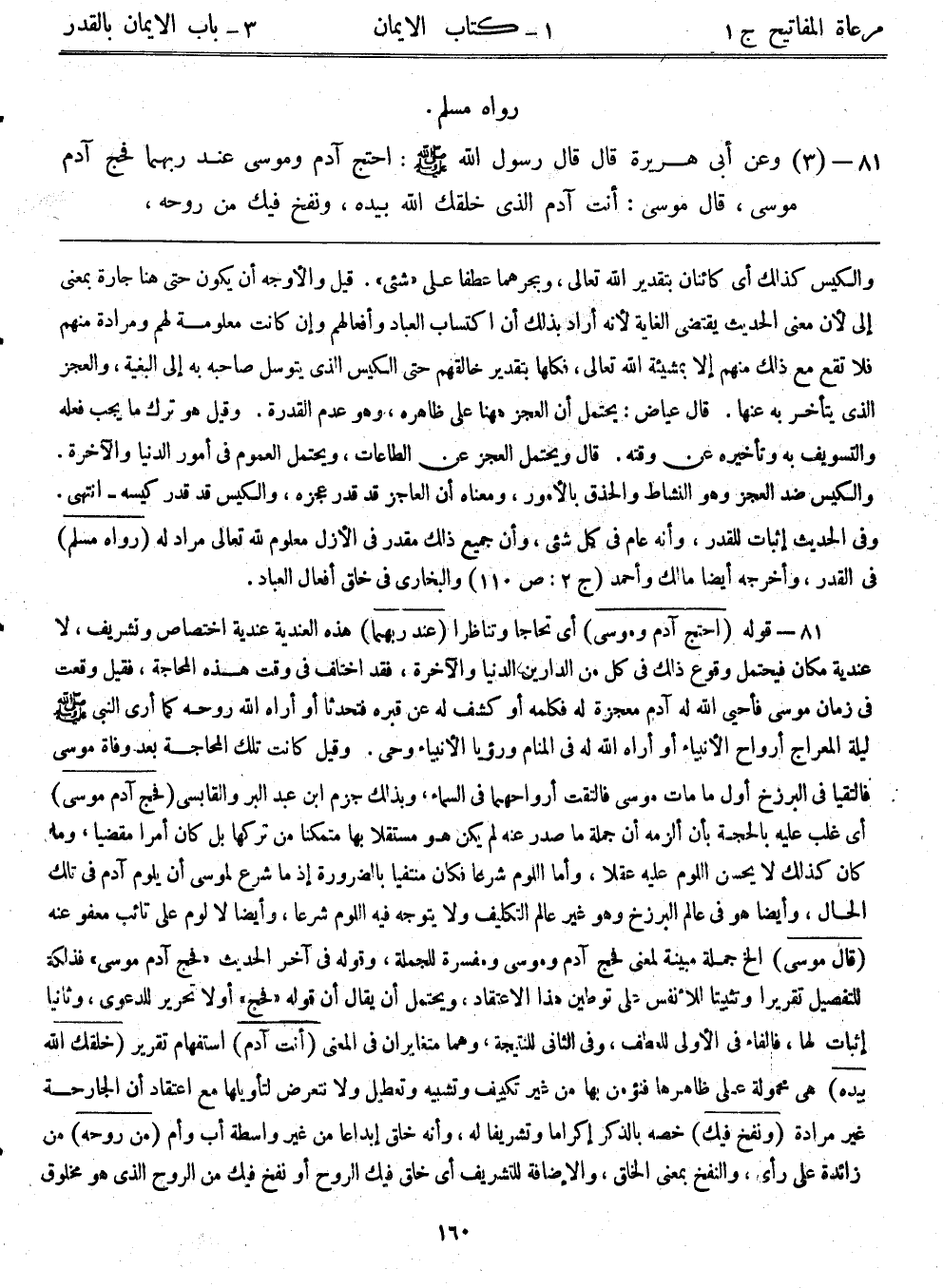 81-قوله: (احتج آدم وموسى) أي تحاجا وتناظرا (عند ربهما) هذه العندية عندية اختصاص وتشريف، لا عندية مكان فيحتمل وقوع ذلك في كل من الدارين الدنيا والآخرة، فقد اختلف في وقت هذه المحاجة، فقيل: وقعت في زمان موسى فأحي الله له آدم معجزة له فكلمه، أو كشف له عن قبره فتحدثا أو أراه الله روحه كما أرى النبي - صلى الله عليه وسلم - ليلة المعراج أرواح الأنبياء أو أراه الله له في المنام ورؤياء الأنبياء وحي. وقيل كانت تلك المحاجة بعد وفاة موسى فالتقيا في البرزخ أو ما مات موسى فالتقت أرواحهما في السماء، وبذلك جزم ابن عبد البر والقابسي (فحج آدم موسى) أي غلب عليه بالحجة بأن ألزمه أن جملة ما صدر عنه لم يكن هو مستقلاً بها متمكناً من تركها بل كان أمرا مقضياً، وما كان كذلك لا يحسن اللوم عليه عقلاً، وأما اللوم شرعاً فكان منتفياً بالضرورة، إذ ما شرع لموسى أن يلوم آدم في تلك الحال، وأيضاً هو في عالم البرزخ وهو غير عالم التكليف ولا يتوجه فيه اللوم شرعاً، وأيضاً لا لوم على تائب معفو عنه (قال موسى) الخ جملة مبنية لمعنى فحج آدم وموسى ومفسره للجملة، وقوله في آخر الحديث "فحج آدم موسى" فذلك للتفصيل تقريراً وتثبيتاً للأنفس على توطين هذا الاعتقاد، ويحتمل أن يقال: أن قوله "فحج" أولاً تحرير للدعوى، وثانياً إثبات لها، فالفاء في الأولى للعطف، وفي الثاني للنتيجة، وهما متغايران في المعنى (أنت آدم) استفهام تقرير (خلقك الله بيده) هي محمولة على ظاهرها فنؤمن بها من غير تكييف وتشبيه وتعطيل ولا تتعرض لتأويلها مع اعتقاد أن الجارحة غير مرادة (ونفخ فيك) خصه بالذكر إكراماً وتشريفاً له، وأنه خلق إبداعاً من غير واسطة أب وأم (من روحه) من زائدة على رأي، والنفخ بمعنى الخلق، والإضافة للتشريف أي خلق فيك الروح أو نفخ فيك من الروح الذي هو مخلوق