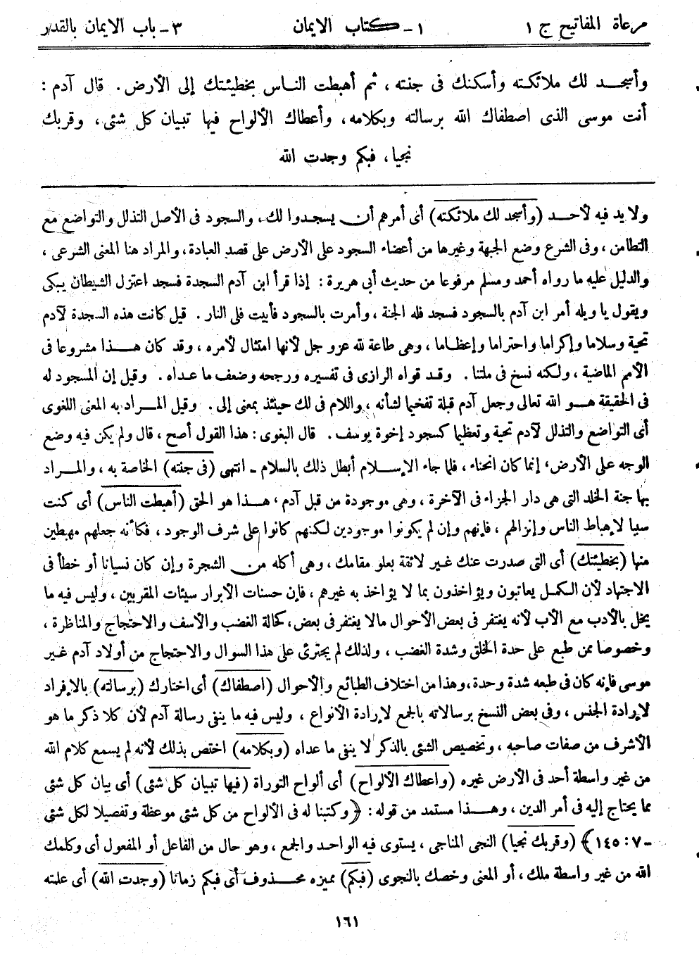 ولا يد فيه لأحد (وأسجد لك ملائكته) أي أمرهم أن يسجدوا لك، والسجود في الأصل التذلل والتواضع مع التطامن، وفي الشرع وضع الجبهة وغيرها من أعضاء السجود على الأرض على قصد العبادة، والمراد هنا المعنى الشرعي، والدليل عليه ما رواه أحمد ومسلم مرفوعاً من حديث أبي هريرة: إذا قرأ ابن آدم السجدة فسجد اعتزل الشيطان يبكي ويقول يا ويله أمر ابن آدم بالسجود فسجد فله الجنة، وأمرت بالسجود فأبيت فلي النار. قيل: كانت هذه السجدة لآدم تحية وسلاماً وإكراماً واحتراماً وإ عظاماً، وهي طاعة لله عزوجل لأنها امتثال لأمره، وقد كان هذا مشروعاً في الأمم الماضية، ولكنه نسخ في ملتنا. وقد قواه الرازي في تفسيره ورجحه وضعف ما عداه. وقيل: إن المسجود له في الحقيقة هو الله تعالى وجعل آدم قبلة تفخيماً لشأنه، واللام في لك حينئذ بمعنى إلى. وقيل: المراد به المعنى اللغوي أي التواضع والتذلل لآدم تحية وتعظيماً كسجود إخوة يوسف. قال البغوي: هذا القول أصح، قال ولم يكن فيه وضع الوجه على الأرض، إنما كان انحناء، فلما جاء الإسلام أبطل ذلك بالسلام – انتهى. (في جتنه) الخاصة به، والمراد بها جنة الخلد التي هي دار الجزاء في الآخرة، وهي وجودة من قبل آدم، هذا هو الحق (أهبطت الناس) أي كنت سبباً لإهباط الناس وإنزالهم، فإنهم وإن لم يكونوا موجودين لكنهم كانوا على شرف الوجود، فكأنه جعلهم مهبطين منها (بخطيئتك) أي التي صدرت عنك غير لائقة بعلو مقامك، وهي أكله من الشجرة وإن كان نسياناً أو خطأ في الاجتهاد؛ لأن الكمل يعاتبون ويؤاخذون بما لا يؤاخذ به غيرهم، فإن حسنات الأبرار سيئات المقربين، وليس فيه ما يخل بالأدب مع الأب لأنه يغتفر في بعض الأحوال ما لا يغتفر في بعض، كحالة الغضب والأسف والاحتجاج والمناظرة، وخصوصاً ممن طبع على حدة الخلق وشدة الغضب، ولذلك لك لم يجترئ على هذا السؤال والاحتجاج من أولاد آدم غير موسى فإنه كان في طبعه شدة وحدة، وهذا من اختلاف الطبائع والأحوال (اصطفاك) أي اختارك (برسالته) بالإفراد لإرادة الجنس، وفي بعض النسخ برسالاته بالجمع لإرادته الأنواع، وليس فيه ما ينفي رسالة آدم لأن كلاً ذكر ما هو الأشرف من صفات صاحبه، وتخصيص الشيء بالذكر لا ينفي ما عداه (وبكلامه) اختص بذلك لأنه لم يسمع كلام الله من غير واسطة أحد في الأرض غيره (وأعطاك الألواح) أي ألواح التوراة (فيها تبيان كل شيء) أي بيان كل شيء مما يحتاج إليه في أمر الدين، وهذا مستمد من قوله: {وكتبنا له في الألواح من كل شيء موعظة وتفصيلاً لكل شيء} [7: 145] ، (وقربك نجياً) النجي المناجي، يستوي فيه الواحد والجمع، وهو حال من الفاعل أو المفعول أي وكلمك الله من غير واسطة ملك، أو المعنى وخصك بالنجوى (فبكم) مميزة محذوف أي فبكم زماناً (وجدت الله) أي علمته