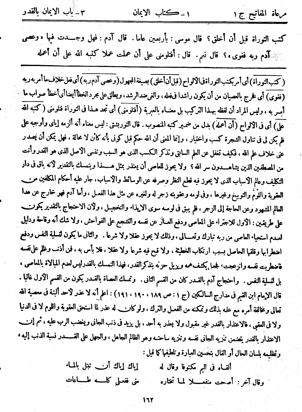 (كتب التوراة) أي أمر بكتب التوراة في الألواح (قبل أن أخلق) بصيغة المجهول (وعصى آدم ربه) أي فعل خلاف ما أمر به ربه (فغوى) أي فخرج بالعصيان من أن يكون راشداً في فعله، والغي ضد الرشد، ويطلق على مجرد الخطأ أيضاً أي أخطأ صواب ما أمر به، وليس المراد أن لفظه بهذا التركيب بل معناه بالعبرية (أفتلومني) أي تجد هذا في التوراة فتلومني (كتبه الله علي) أي في الألواح (أن أعمله) بدل من ضمير كتبه المنصوب. قال التوربشتي: ليس معناه أنه ألزمه إياي وأوجبه علي فلم يكن لي في تناول الشجرة كسب واختيار، وإنما المعنى أن الله حكم قبل كوني بأنه كائن لا محالة، فهل يمكن أن يصدر عني خلاف علم الله، فكيف تغفل عن العلم السابق وتذكر الكسب الذي هو السبب وتنسى الأصل الذي هو القدر وأنت من المصطفين الذين يشاهدون سر الله؟ ولا يجوز للعاصي أن يعتذر بمثل هذا وبتمسك بالتقدير لأنه باق في دار التكليف وعالم الأسباب الذي لا يجوز فيه قطع النظر وصرفه عن الوسائط والأسباب، جار عليه أحكام المكلفين من العقوبة واللوم والتوبيخ وغيرها، وفي لومه وعقوبته زجر له ولغيره عن مثل هذا الفعل، وأما آدم فهو خارج عن هذا العالم المشهود وعن الحاجة إلى الزجر، فلم يبق في لومه سوى الإيذاء والتخجيل، ولأن الاحتجاج بالتقدير يكون على طريقين" الأول للاجتراء على المعاصي ودفع العار عن نفسه والتشجيع على الفواحش، ولا شك أنه وقاحة، والدليل لعدم استحياء العاصي من ربه تبارك وتعالى، وذلك لا يجوز عقلاً ولا شرعاً. والثاني ما يكون لتسلية النفس ودفع اضطرابها وقلقها الحاصل بسبب ارتكاب الخطيئة، ولا قبح فيه شرعاً ولا عقلاً، فلا بأس به، فمن أذنب وظلم على نفسه فاضطربت نفسه وانزعجت، فجعل يكشف همه ويزيل حزنه بتذكر القدر، فهذا التمسك بالقدر ليس لعدم المبالاة بالمعاصي، بل لتسلية النفس. واحتجاج آدم بالقدر كان من القسم الثاني. وتمسك العصاة بالقدر يكون من القسم الأول غالباً. قال الإمام ابن القيم في مدارج السالكين (ج1:ص189، 190، 191) : اعلم أنه لا عذر لأحد البتة في معصية الله تعالى ومخالفة أمره مع علمه بذلك وتمكنه من الفعل والترك، ولو كان له عذر لما استحق العقوبة واللوم لا في الدنيا ولا في العقبى، فالاعتذار بالقدر غير مقبول ولا يعذر به أحد، بل يزيد في ذنب الجاني ويغضب الرب عليه، ثم إن الاعتذار بالقدر يتضمن تنزيه الجاني نفسه وتنزيه ساحته وهو الظالم الجاهل، والجهل على القدر نسبة الذنب إليه، وتظليمه بلسان الحال أو القال بتحسين العبارة وتلطيفها كما قيل: