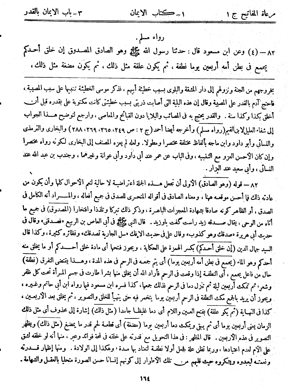 82- (4) وعن ابن مسعود قال: حدثنا رسول الله - صلى الله عليه وسلم - وهو الصادق المصدوق: ((إن خلق أحدكم يجمع في بطن أمه أربعين يوماً نطفة، ثم يكون علقة مثل ذلك، ثم يكون مضغة مثل ذلك،