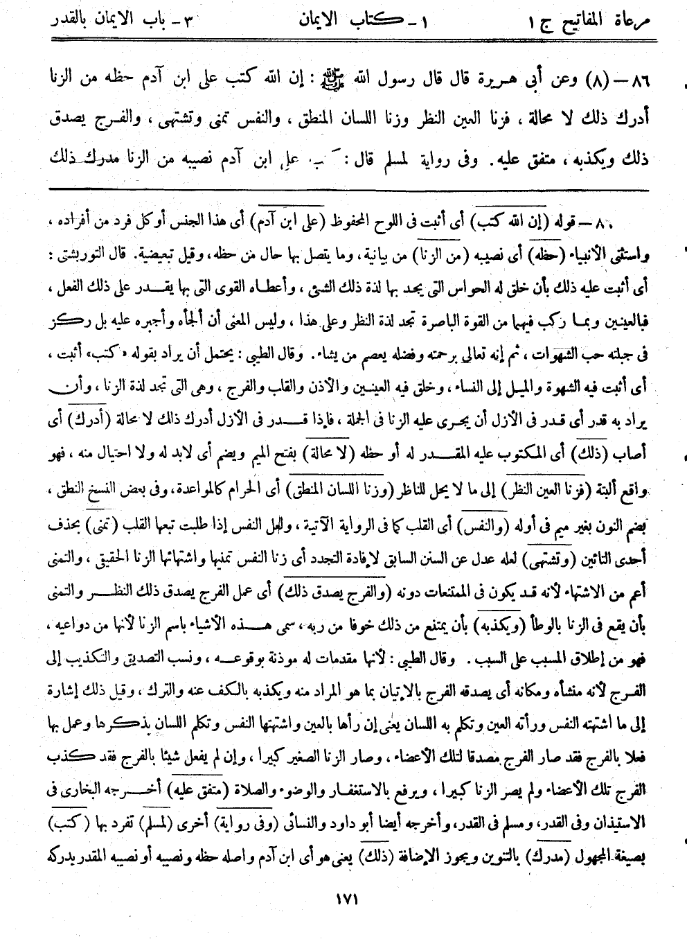 86-قوله: (إن الله كتب) أي أثبت في اللوح المحفوظ. (على ابن آدم) أي هذا الجنس أو كل فرد من أفراده، واستثنى الأنبياء (حظه) أي نصيبه (من الزنا) من بيانية، وما يتصل بها حال من حظه، وقيل: تبعيضية. وقال التوربشتي: أي أثبت عليه ذلك بأن خلق له الحواس التي يجد بها لذة ذلك الشيء، وأعطاه القوى التي بها يقدر على ذلك الفعل، فبالعينين بما ركب فيهما من القوة الباصرة تجد لذة النظر، وعلى هذا ليس المعنى أن ألجأه وأجبره عليه، بل ركز في جبلته حب الشهوات، ثم إنه تعالى برحمته وفضله يعصم من يشاء. وقال الطيبي: يحتمل أن يراد بقوله "كتب" أثبت، أي أثبت فيه الشهوة والميل إلى النساء، وخلق فيه العينين والأذن والقلب والفرج، وهي التي تجد لذة الزنا، وأن يراد به قدر أي قدر في الأزل أن يجري عليه الزنا في الجملة، فإذا قدر في الأزل أدرك ذلك لا محالة (أدرك) أي أصاب (ذلك) أي المكتوب عليه المقدر له أو حظه (لا محالة) بفتح الميم ويضم، أي لابد له ولا احتيال منه، فهو واقع البتة (فزنا العين النظر) إلى ما لا يحل للناظر (وزنا اللسان المنطق) أي الحرام كالمواعدة، وفي بعض النسخ النطق، بضم النون بغير ميم في أوله (والنفس) أي القلب كما في الرواية الآتية، ولعل النفس إذا طلبت تبعها القلب (تمنى) بحذف إحدى التائين (وتشتهي) لعله عدل عن السنن السابق لإفادة التجدد، أي زنا النفس تمنيها واشتهائها الزنا الحقيقي، والتمني أعم من الاشتهاء؛ لأنه قد يكون في الممتنعات دونه (والفرج يصدق ذلك) أي عمل الفرج يصدق ذلك النظر والتمني بأن يقع في الزنا بالوطء. (ويكذبه) بأن يمتنع من ذلك خوفاً من ربه، سمى هذه الأشياء باسم الزنا لأنها من دواعيه، فهو من إطلاق المسبب على السبب. وقال الطيبي: لأنها مقدمات له مؤذنة بوقوعه، ونسب التصديق والتكذيب إلى الفرج لأنه منشأه ومكانه أي يصدقه الفرج بالإتيان بما هو المراد منه ويكذبه بالكف عنه والترك، وقيل: ذلك إشارة إلى ما اشتهته النفس ورأته العين وتكلم به اللسان، يعني إن رآها بالعين واشتهتها النفس وتكلم اللسان بذكرها وعمل بها فعلاً بالفرج، فقد صار الفرج مصدقاً لتلك الأعضاء، وصار الزنا الصغير كبيراً، وإن لم يفعل شيئاً بالفرج فقد كذب الفرج تلك الأعضاء ولم يصر الزنا كبيراً، ويرفع بالاستغفار والوضوء والصلاة. (متفق عليه) أخرجه البخاري في الاستئذان وفي القدر، ومسلم في القدر، وأخرجه أيضاً أبوداود والنسائي. (وفي رواية) أخرى (لمسلم) تفرد بها (كتب) بصيغة المجهول (مدرك) بالتنوين ويجوز الإضافة (ذلك) يعني هو أي ابن آدم واصله حظه ونصيبه أو نصيبه المقدر يدركه