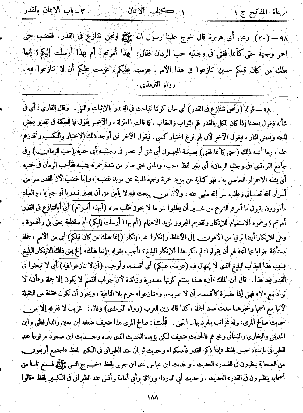 98- (20) وعن أبي هريرة قال: ((خرج علينا رسول الله - صلى الله عليه وسلم - ونحن نتنازع في القدر، فغضب حتى أحمر وجهه حتى كأنما فقئ في وجنتيه حب الرمان، فقال: أبهذا أمرتم، أم بهذا أرسلت إليكم؟ إنما هلك من كان قبلكم حين تنازعوا في هذا الأمر، عزمت عليكم، عزمت عليكم أن لا تنازعوا فيه)) ، رواه الترمذي.