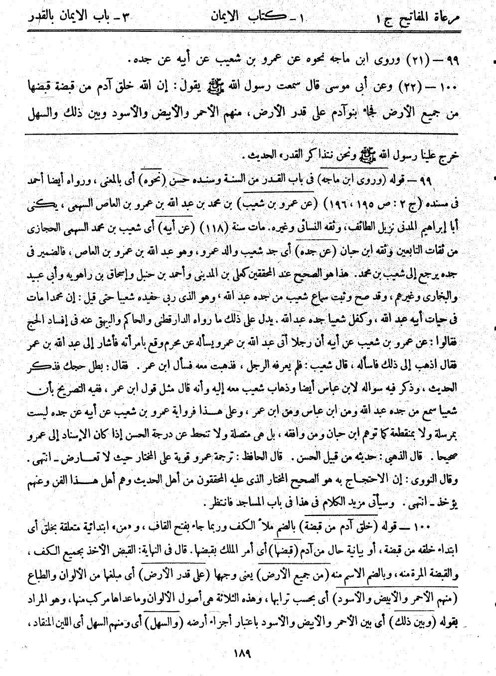 99- قوله: (وروى ابن ماجة) في باب القدر من السنة وسنده حسن. (نحوه) أي بالمعنى، ورواه أيضاً أحمد في مسنده (ج2: ص196، 195) (عن عمرو بن شعيب) بن محمد بن عبد الله بن عمرو بن العاص السهمي، يكني أبا إبراهيم المدني نزيل الطائف، وثقة النسائي وغيره. مات سنة (118) . (عن أبيه) أي شعيب بن محمد السهمي الحجازي، من ثقات التابعين وثقة ابن حيان. (عن جده) أي جد شعيب والد عمرو، وهو عبد الله بن عمرو بن العاص، فالضمير في جده يرجع إلى شعيب بن محمد. هذا هو الصحيح عند المحققين كعلي بن المديني وأحمد بن حنبل وإسحاق بن راهوية وأبي عبيدة والبخاري وغيرهم، وقد صح وثبت سماع شعيب من جده عبد الله، وهو الذي ربى حفيده شعيباً، حتى قيل: إن محمداً مات في حياة أبيه عبد الله، وكفل شعيباً جده عبد الله، يدل على ذلك ما رواه الدارقطني والحاكم والبيهقي عنه في إفساد الحج، فقالوا: عن عمرو بن شعيب عن أبيه أن رجلاً أتى عبد الله بن عمرو يسأله عن محرم وقع بامرأته فأشار إلى عبد الله بن عمر فقال: اذهب إلى ذلك فاسأله، قال شعيب: فلم يعرفه الرجل، فذهبت معه فسأل ابن عمر. فقال: بطل حجك فذكر الحديث، وذكر فيه سؤاله لابن عباس أيضاً، وذهاب شعيب معه إليه، وأنه قال مثل قول ابن عمر، ففيه التصريح بأن شعيباً سمع من جده عبد الله ومن ابن عباس ومن ابن عمر، وعلى هذا فرواية عمرو بن شعيب عن أبيه عن جده ليست بمرسلة ولا بمنقطعة كما توهم ابن حبان ومن وافقه، بل هي متصلة ولا تنحط عن درجة الحسن إذا كان الإسناد إلى عمرو صحيحاً. قال الذهبي: حديثه من قبيل الحسن. قال الحافظ: ترجمة عمرو قوية على المختار حيث لاتعارض - انتهى. وقال النووي: إن الاحتجاج به هو الصحيح المختار الذي عليه المحققون من أهل الحديث، وهم أهل هذا الفن وعنهم يؤخذ -انتهى. وسيأتي مزيد الكلام في هذا في باب المساجد فانتظر.