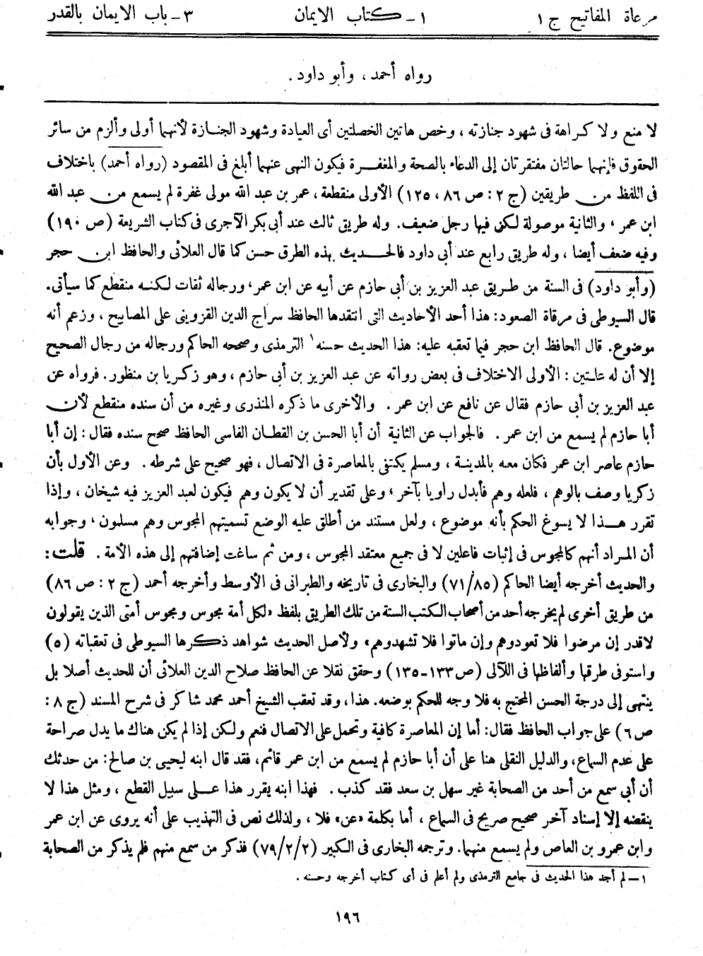 لا منع ولا كراهة في شهود جنازته، وخص هاتين الخصلتين أي العيادة وشهود الجنازة؛ لأنهما أولى وألزم من سائر الحقوق، فإنهما حالتان مفتقرتان إلى الدعاء بالصحة والمغفرة، فيكون النهي عنهما أبلغ في المقصود. (رواه أحمد) باختلاف في اللفظ من طريقين (ج2: ص125، 86) الأولى منقطعة، عمر بن عبد الله مولى غفره لم يسمع من عبد الله ابن عمر، والثانية موصولة لكن فيها رجل ضعيف، وله طريق ثالث عند أبي بكر الآجري في كتاب الشريعة (ص190) ، وفيه ضعف أيضاً، وله طريق رابع عند أبي داود، فالحديث بهذه الطرق حسن كما قال العلائي والحافظ ابن حجر، (وأبي داود) في السنة من طريق عبد العزيز بن أبي حازم عن أبيه عن ابن عمر، ورجاله ثقات لكنه منقطع كما سيأتي. قال السيوطي في مرقاة الصعود: هذا أحد الأحاديث التي انتقدها الحافظ سراج الدين القزويني على المصابيح، وزعم أنه موضوع. قال الحافظ ابن حجر فيما تعقبه عليه: هذا الحديث حسنه الترمذي وصححه الحاكم ورجاله من رجال الصحيح إلا أن له علتين: الأولى الاختلاف في بعض رواته عن عبد العزيز بن أبي حازم، وهو زكريا بن منظور. فرواه عن عبد العزيز بن أبي حازم فقال: عن نافع عن ابن عمر. والأخرى ما ذكره المنذري وغيره من أن سنده منقطع؛ لأن أباحازم لم يسمع من ابن عمر. فالجواب عن الثانية أن أباالحسن بن القطان الفاسي الحافظ صحح سنده، فقال: إن أباحازم عاصر ابن عمر فكان معه بالمدينة، ومسلم يكتفي بالمعاصرة في الاتصال، فهو صحيح على شرطه. وعن الأول بأن زكريا وصف بالوهم، فلعله وهم فأبدل رواياً بآخر، وعلى تقدير أن لا يكون وهم فيكون لعبد العزيز فيه شيخان، وإذا تقرر هذا لا يسوغ الحكم بأنه موضوع، ولعل مستند من أطلق عليه الوضع تسميتهم المجوس وهو مسلمون، وجوابه أن المراد أنهم كالمجوس في إثبات فاعلين لا في جميع معتقد المجوس، ومن ثم ساغت إضافتهم إلى هذه الأمة. قلت: والحديث أخرجه أيضاً الحاكم (85/71) والبخاري في تاريخه والطبراني في الأوسط وأخرجه أحمد (ج2:ص86) من طريق أخرى لم يخرجه أحد من أصحاب الكتب الستة من تلك الطريق بلفظ: ((لكل أمة مجوس ومجوس أمتي الذين يقولون لا قدر، إن مرضوا فلا تعودوهم، وإن ماتوا فلا تشهدوهم)) ، ولأصل الحديث شواهد ذكرها السيوطي في تعقباته (5) ، واستوفي طرقها وألفاظها في الآلي (ص133-135) وحقق نقلاً عن الحافظ صلاح الدين العلائي أن للحديث أصلاً، بل ينتهي إلى درجة الحسن المحتج به، فلا وجه للحكم بوضعه. هذا، وقد تعقب الشيخ أحمد محمد شاكر في شرح المسند (ج8: ص6) على جواب الحافظ فقال: أما إن المعاصرة كافية وتحمل على الاتصال فنعم، ولكن إذا لم يكن هناك ما يدل صراحة على عدم السماع، والدليل النقلي هنا على أن أباحازم لم يسمع من ابن عمرقائم، فقد قال ابنه ليحيى بن صالح: من حدثك أن أبي سمع من أحد من الصحابة غير سهل بن سعد فقد كذب. فهذا ابنه يقرر هذا على سبيل القطع، ومثل هذا لا ينقضه إلا إسناد آخر صحيح صريح في السماع، أما بكلمة "عن" فلا، ولذلك نص في التهذيب على أنه يروي عن ابن عمر وابن عمرو بن العاص ولم يسمع منهما. وترجمه البخاري في الكبير (2/2/79) فذكر من سمع منهم، فلم يذكر من الصحابة
