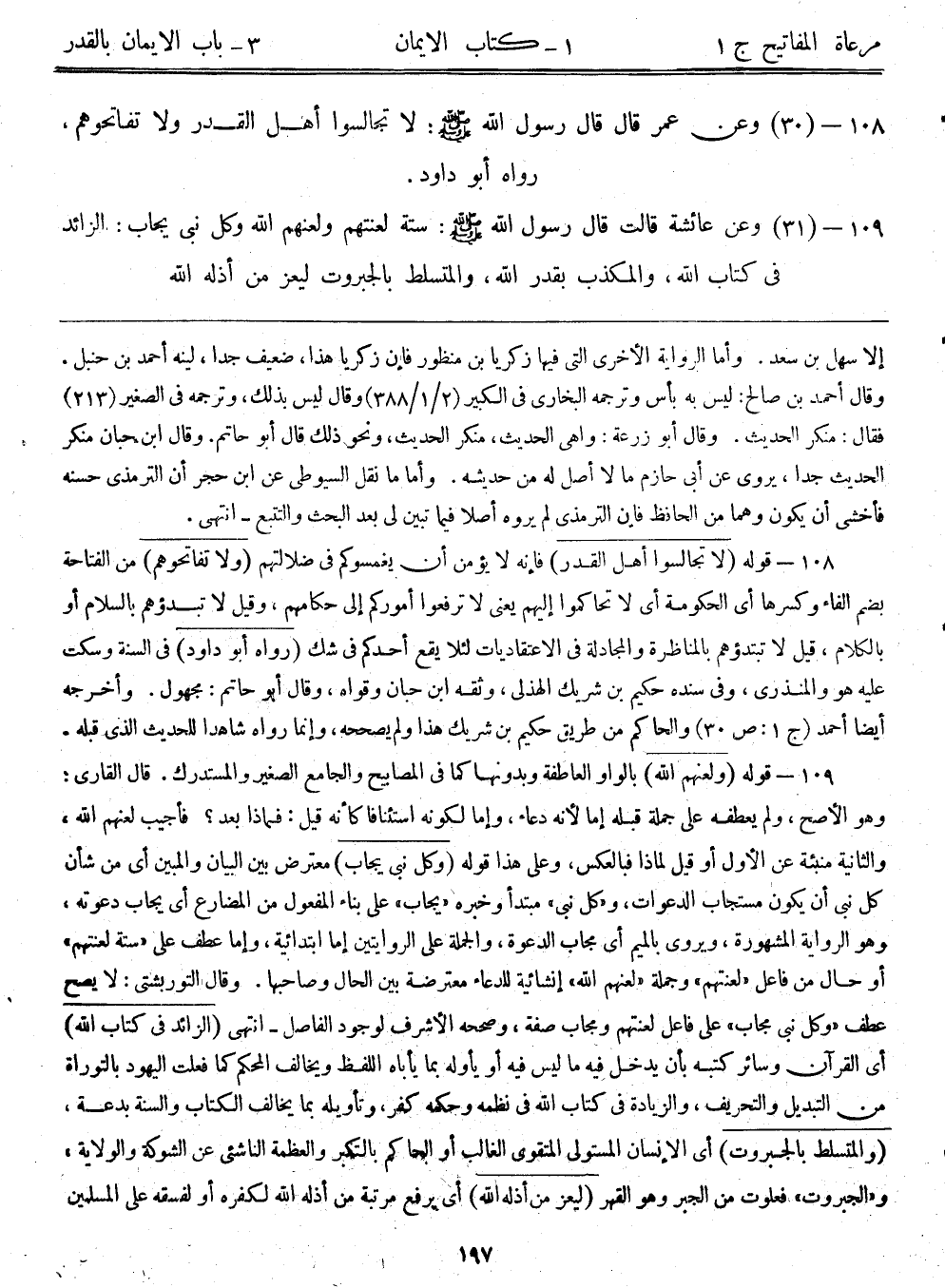 108- (30) وعن عمر قال: قال رسول الله - صلى الله عليه وسلم -: ((لا تجالسوا أهل القدر ولا تفاتحوهم)) ، رواه أبوداود.