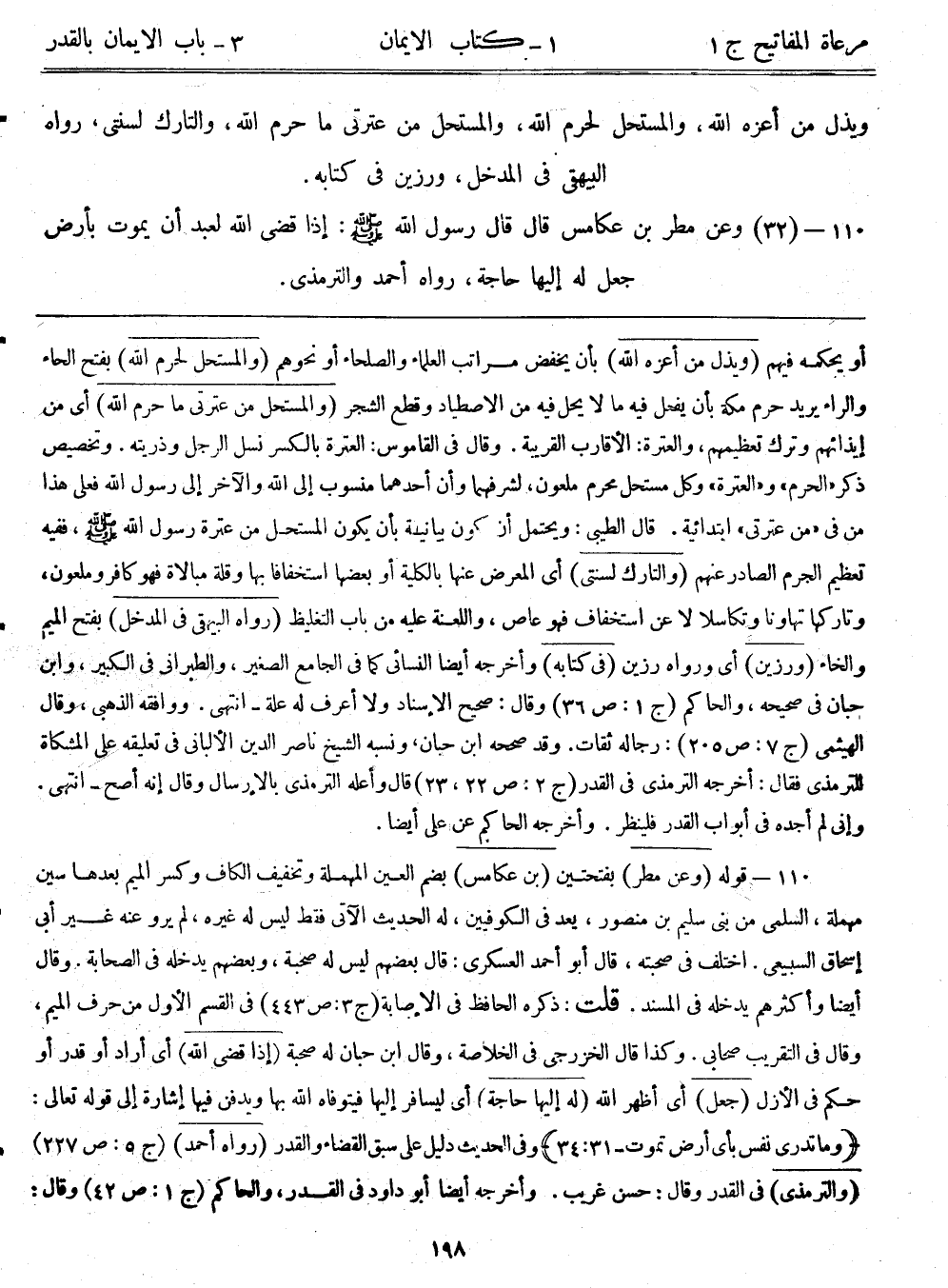 110- قوله: (وعن مطر) بفتحتين (بن عكامس) بضم العين المهملة وتخفيف الكاف وكسر الميم بعدها سين مهملة، السلمي من بني سليم بن منصور، يعد في الكوفيين، له الحديث الآتي فقط ليس له غيره، لم يرو عنه غير أبي إسحاق السبيعي. اختلف في صحبته، قال أبوأحمد العسكري: قال بعضهم ليس له صحبة، وبعضهم يدخله في الصحابة. وقال أيضاً، وأكثرهم يدخله في المسند. قلت: ذكره الحافظ في الإصابة (ج3:ص443) في القسم الأول من حرف الميم، وقال في التقريب صحابي. وكذا قال الخزرجي في الخلاصة، وقال ابن حبان له صحبة (إذا قضى الله) أي أراد أو قدر أو حكم في الأزل (جعل) أي أظهر الله (له إليها حاجة) أي ليسافر إليها فيتوفاه الله بها ويدفن فيها إشارة إلى قوله تعالى: {وما تدري نفس بأي أرض تموت} [34:31] . وفي الحديث دليل على سبق القضاء والقدر (رواه أحمد) (ج5:ص227) (والترمذي) في القدر وقال: حسن غريب. وأخرجه أيضاً أبوداود في القدر، والحاكم (ج1:ص42) وقال: