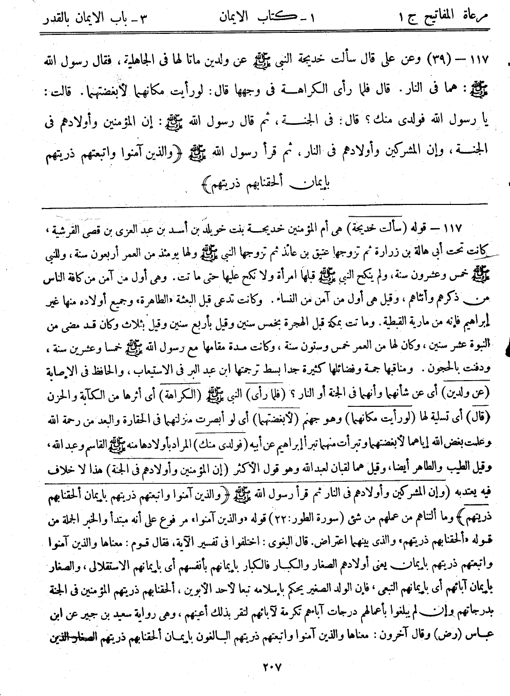 117- قوله: (سألت خديجة) هي أم المؤمنين خديجة بنت خويلد بن أسد بن عبد العزى بن قصي القرشية، كانت تحت أبي هالة بن زراره ثم تزوجها عتيق بن عائذ ثم تزوجها النبي - صلى الله عليه وسلم - ولها يومئذٍ من العمر أربعون سنة، وللنبي - صلى الله عليه وسلم - خمس وعشرون سنة، ولم ينكح النبي - صلى الله عليه وسلم - قبلها امرأة ولا نكح عليها حتى ماتت. وهي أول من آمن من كافة الناس من ذكرهم وأنثاهم، وقيل: هي أول من آمن من النساء. وكانت تدعى قبل البعثة "الطاهرة"، وجميع أولاده منها غير إبراهيم فإنه من مارية القبطية. وماتت بمكة قبل الهجرة بخمس سنين، وقيل: بأربع سنين وقيل: بثلاث وكان قد مضى من النبوة عشر سنين، وكان لها من العمر خمس وستون سنة، وكانت مدة مقامها مع رسول الله - صلى الله عليه وسلم - خمساً وعشرين سنة، ودفنت بالحجون. ومناقبها جمة، وفضائلها كثيرة جداً، بسط ترجمتها ابن عبد البر في الاستيعاب، والحافظ في الإصابة. (عن ولدين) أي عن شأنهما وأنهما في الجنة أو النار؟ (فلما رأى) النبي - صلى الله عليه وسلم - (الكراهة) أي أثرها من الكآبة والحزن (قال) أي تسلية لها (لو رأيت مكانهما) وهو جهنم (لأبغضتهما) أي لو أبصرت منزلتهما في الحقارة والبعد من رحمة الله وعلمت بغض الله إياهما لأبغضتهما وتبرأت منهما تبرأ إبراهيم عن أبيه. (فولدي منك) المراد بأولادها منه - صلى الله عليه وسلم - القاسم وعبد الله، وقيل: الطيب والطاهر أيضاً، وقيل: هما لقبان لعبد ال، له وهو قول الأكثر (إن المؤمنين وأولادهم في الجنة) هذا لا خلاف فيه يعتد به (وإن المشركين وأولادهم في النار ثم قرأ رسول الله - صلى الله عليه وسلم - {واللذين آمنوا واتبعتهم ذريتهم بإيمان ألحقنا بهم ذريتهم وما ألتناهم من عملهم من شيء} [سورة الطور:22] . قوله: {والذين آمنوا} مرفوع على أنه مبتدأ والخبر الجملة من قوله: {ألحقنا بهم ذريتهم} والذي بينهما اعتراض. قال البغوي: اختلفوا في تفسير الآية، فقال قوم: معناها والذين آمنوا واتبعتهم ذريتهم بإيمان يعني أولادهم الصغار والكبار فالكبار بإيمانهم بأنفسهم أي بأيمانهم الاستقلالي، والصغار بإيمان آبائهم، أي بإيمانهم التبعي، فإن الولد الصغير يحكم بإسلامه تبعاً لأحد الأبوين، {ألحقنا بهم ذريتهم} المؤمنين في الجنة بدرجاتهم وإن لم يبلغو بأعمالهم درجات آباءهم تكرمة لآبائهم لتقر بذلك أعينهم، وهي رواية سعيد بن جبير عن ابن عباس رضي الله عنهما. وقال آخرون: معناها {والذين آمنوا واتبعتهم ذريتهم} البالغون {بإيمان ألحقنا ذريتهم} الصغار الذين