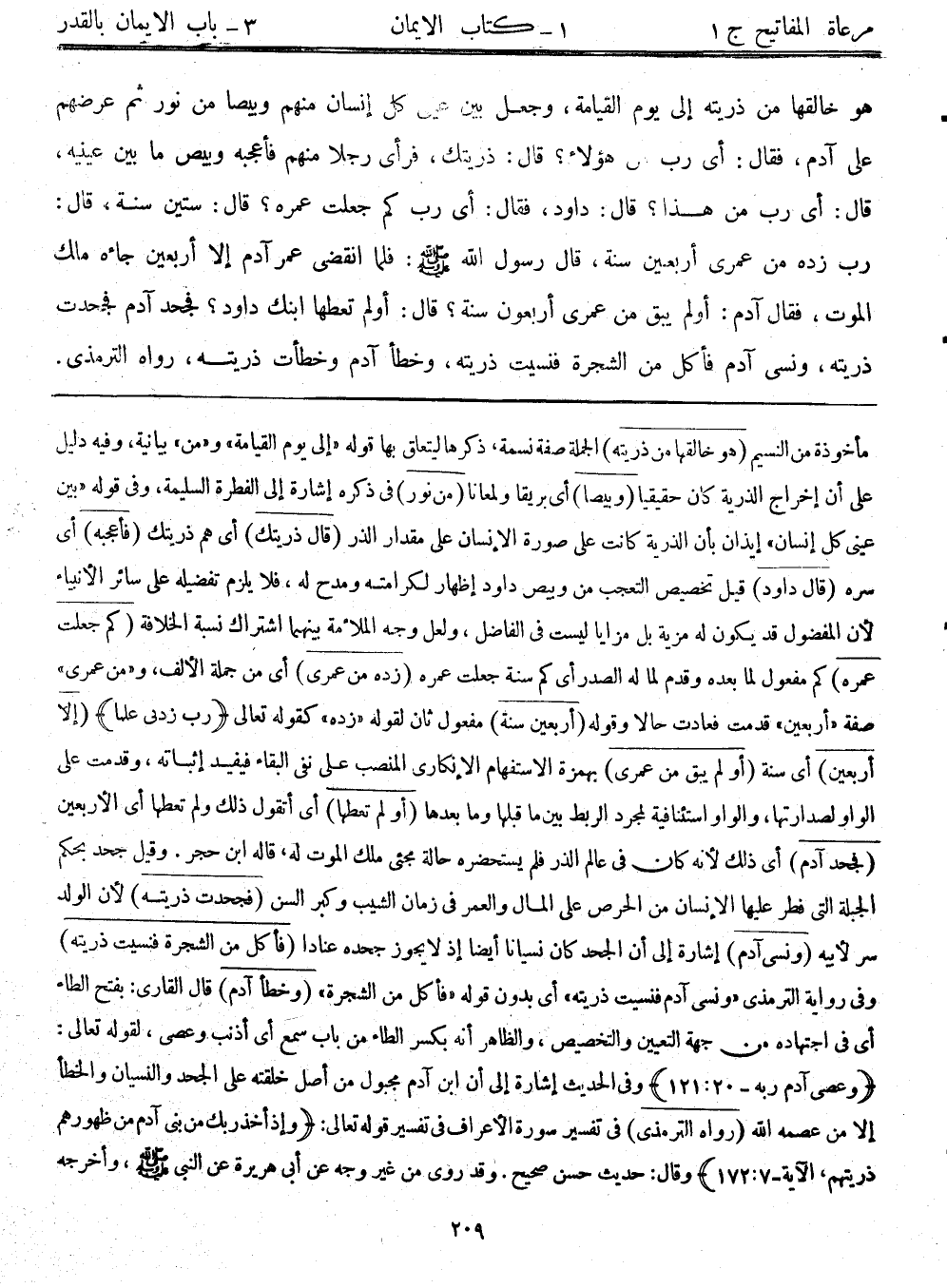 مأخوذة من النسيم (هو خالقها من ذريته) الجملة صفة نسمة، ذكرها ليتعلق بها قوله: " إلى يوم القيامة" و"من" بيانية، وفيه دليل على أن إخراج الذرية كان حقيقياً (وبيصاً) أي بريقاً ولمعاناً (من نور) في ذكره إشارة إلى الفطرة السليمة، وفي قوله: "بين عيني كل إنسان" إيذان بأن الذرية كانت على صورة الإنسان على مقدار الذر (قال: ذريتك) أي هم ذريتك (فأعجبه) أي سره قال داود) قيل تخصيص التعجب من وبيص داود إظهار لكرامته ومدح له، فلا يلزم تفضيله على سائر الأنبياء؛ لأن المفضول قد يكون له مزية بل مزايا ليست في الفاضل، ولعل وجه الملائمة بينهم اشتراك نسبة الخلافة. (كم جعلت عمره) كم مفعول لما بعده، وقدم لما له الصدر أي كم سنة جعلت عمره (زده من عمري) أي من جملة الألف، و "من عمري" صفة "أربعين" قدمت فعادت حالاً وقوله: (أربعين سنة) مفعول ثان لقوله: "زده" كقوله تعالى: {رب زدني علما} . (إلا أربعين) أي سنة (أولم يبق من عمري) بهمزة الاستفهام الإنكاري المنصب على نفي البقاء فيقيد إثباته، وقدمت على الواو لصدارتها، والواو استئنافية لمجرد الربط بين ما قبلها وما بعدها. (أولم تعطها) أي أتقول ذلك ولم تعطها أي الأربعين (فحجه آدم) أي ذلك؛ لأنه كان في عالم الذر فلم يستحضره حالة مجئي ملك الموت له، قاله ابن حجر. وقيل: حج بحكم الجبلة التي فطر عليها الإنسان من الحرص على المال والعمر في زمان الشيب وكبر السن. (فجحدت ذريته) ؛ لأن الولد سر لأبيه (ونسى آدم) إشارة إلى أن الجحد كان نسياناً أيضاً إذ لا يجوز جحده عنادا (فأكل من الشجرة فنسيت ذريته) وفي رواية الترمذي "ونسى آدم فنسيت ذريته" أي بدون قوله: "فأكل من الشجرة" (وخطأ آدم) قال القاري: بفتح الطاء أي في اجتهاده من جهة التعيين والتخصيص، والظاهر أنه بكسر الطاء من باب سمع أي أذنب وعصى، لقوله تعالى:: {وعصى آدم ربه} [121:20] . وفي الحديث إشارة إلى أن ابن آدم مجبول من أصل خلقته على الجحد والنسيان والخطأ إلا من عصمه الله. (رواه الترمذي) في تفسير سورة الأعراف في تفسير قوله تعالى: {وإذ أخذ ربك من بني آدم من ظهورهم ذريتهم..} الآية [172:7] وقال: حديث حسن صحيح. وقد روي من غير وجه عن أبي هريرة عن النبي - صلى الله عليه وسلم -، وأخرجه