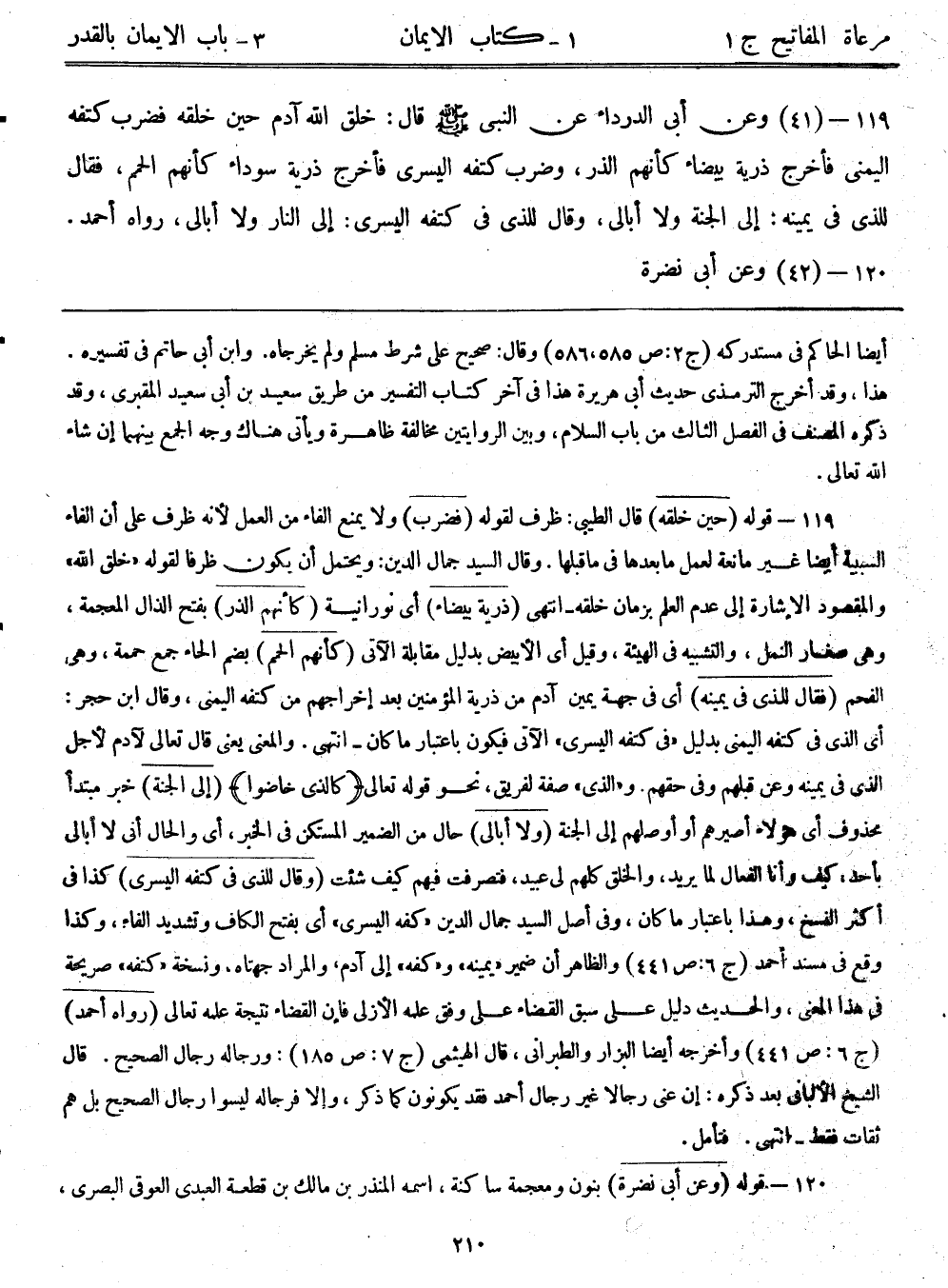 119- قوله: (حين خلقه) قال الطيبي: ظرف لقوله: (فضرب) ولا يمنع الفاء من العمل؛ لأنه ظرف على أن الفاء السبية أيضاً غير مانعة لعمل ما بعدها في ما قبلها. وقال السيد جمال الدين: ويحتمل أن يكون ظرفاً لقوله: "خلق الله" والمقصود الإشارة إلى عدم العلم بزمان خلقه –انتهى. (ذرية بيضاء) أي نورانية (كأنهم الذر) بفتح الذال المعجمة، وهي صغار النمل، والتشبيه في الهيئة، وقيل: أي الأبيض بدليل مقابلة الآتي (كأنهم الحمم) بضم الحاء جمع حممة، وهي الفحم (فقال للذي في يمينه) أي في جهة يمين آدم من ذرية المؤمنين بعد إخراجهم من كتفه اليمنى، وقال ابن حجر: أي الذي في كتفه اليمنى بدليل "في كتفه اليسرى" الآتي فيكون باعتبار ما كان –انتهى. والمعنى يعني قال تعالى لآدم لأجل الذي في يمينه وعن قبلهم وفي حقهم. و"الذي" صفة لفريق، نحو قوله تعالى: {كالذي خاضوا) (إلى الجنة) خبر مبتدأ محذوف أي هؤلاء أصيرهم أو أوصلهم إلى الجنة، (ولا أبالي) حال من الضمير المستكن في الخبر، أي والحال أني لا أبالي بأحد، كيف وأنا الفعال لما يريد، والخلق كلهم لي عبيد، فتصرفت فيهم كيف شئت. (وقال للذي في كتفه اليسرى) كذا في أكثر النسخ، وهذا باعتبار ما كان، وفي أصل السيد جمال الدين "كفه اليسرى" أي بفتح الكاف وتشديد الفاء، وكذا وقع في مسند أحمد (ج6:ص441) والظاهر أن ضمير "يمينه" و"كفه" إلى آدم، والمراد جهتاه، ونسخة "كتفه" صريحة في هذا المعنى، والحديث دليل على سبق القضاء على وفق علمه الأزلي، فإن القضاء نتيجة علمه تعالى. (رواه أحمد) (ج6:ص441) . وأخرجه أيضاً البزار والطبراني، قال الهيثمي (ج7:ص185) : ورجاله رجال الصحيح. قال الشيخ الألباني بعد ذكره: إن عني رجالاً غير رجال أحمد فقد يكونون كما ذكر، وإلا فرجاله ليسوا رجال الصحيح بل هم ثقات فقط-انتهى. فتأمل.